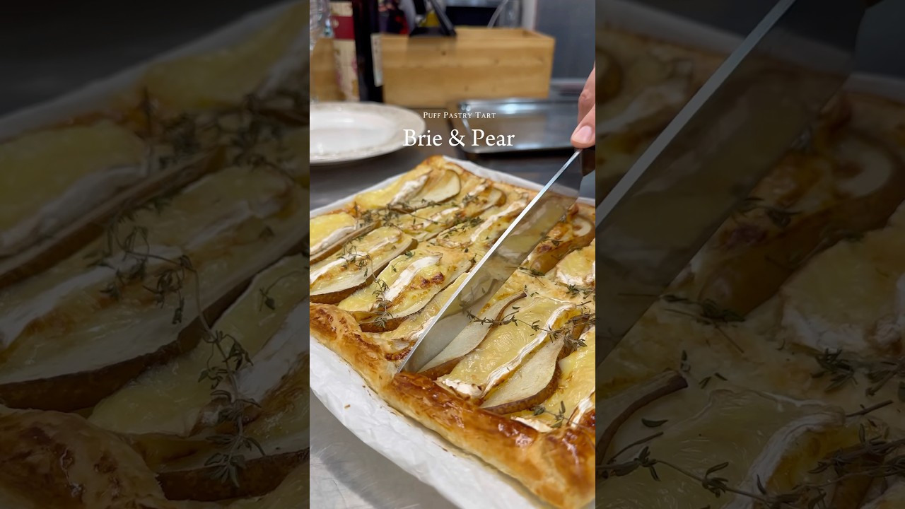 Instructions: 1) Preheat the oven: Set to 200°C (392°F). 2) Prepare the puff pastry: Unroll the thawed puff pastry sheet onto a parchment-lined baking tray. Create a border by folding or pinching the edges up about 1 cm (½ inch) all around to form a raised “frame” to hold the filling. 3) Assemble the filling: Evenly spread the sliced Brie inside the raised border. Arrange the thinly sliced pears in neat rows or a decorative pattern over the Brie (as shown in the photo). If desired, drizzle honey over the pears and sprinkle with fresh thyme leaves. 4) Apply egg wash: Whisk the egg yolk with 1 tbsp water to make an egg wash. Brush it over the raised border of the pastry for a golden, glossy finish. 5) Bake: Place in the preheated oven and bake for 15–18 minutes, or until the pastry border puffs up and turns golden brown. 6) Serve: Allow to cool slightly before slicing. Serve warm as an appetizer or light dessert.