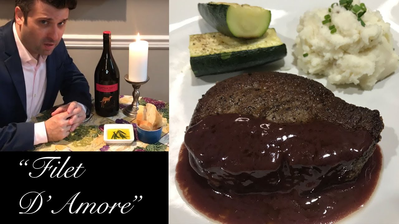 In this Valentine’s Day Special, aptly named “FILET D’AMORE” [translation “Filet of Love”], we show you how to set a romantic dinner table and deliver a mouthwatering meal. The main course features Cast Iron Cooked Beef Tenderloin Filet Mignon with a Shallot Red Wine Reduction Sauce (Similar to a French-style Demi Glace). We accompany the steak with Truffle Mashed Potatoes and Roasted Zucchini. Since it’s a Special – we threw in a salad (Heart of Romaine with Parmigiano Reggiano Cheese, Grape Tomatoes, and a Fresh Squeezed Lemon and White Vinegar Dressing)……and a song to woo your date – so you’re all set to sweep your valentine off their feet.