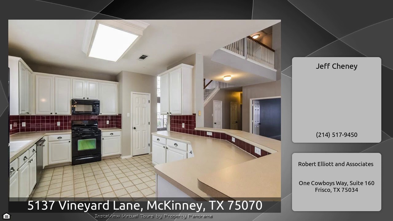 The Virtual Tour for the property at 5137 Vineyard Lane, McKinney, TX 75070 listed for $315,000: Other homes for sale by Jeff Cheney of Robert Elliott and Associates: Beautiful well-maintained home in sought after Eldorado Heights. Warm and inviting, spacious living rooms, study with French doors, fresh paint & carpet throughout. Large formal living and dining is perfect for entertaining. Spacious family room opens to kitchen Great kitchen features, gas cooktop, lots of counter & cabinet space and walk in pantry. Breakfast nook surrounded with windows and features bench seat. Private master …