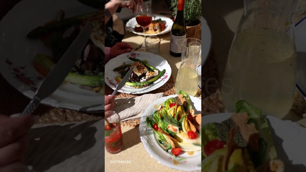 4k video footage of group of people having gourmet dinner with seafood, chicken and salad served on French style plates on the table with cocktails and wine in cafe patio during sunny day