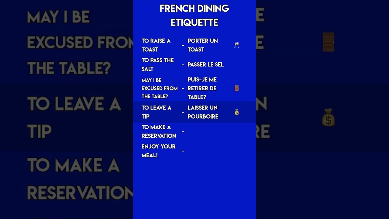 Learn key French dining etiquette phrases to navigate French restaurants with confidence. From toasting to asking for the bill, this video helps A2-B2 learners dine like a local!
