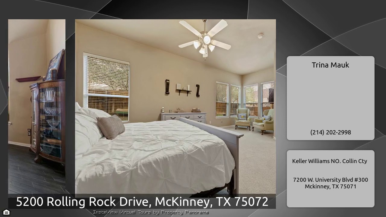 The Virtual Tour for the property at 5200 Rolling Rock Drive, McKinney, TX 75072 listed for $364,900: Other homes for sale by Trina Mauk of Keller Williams NO. Collin Cty: WELCOME HOME!Beautiful&Spacious home on corner lot with an AMAZING floorplan!Private office with updated french doors&flooring with beautiful built ins!The dining room has updated flooring and is perfect for formal meals!The Gourmet Kitchen is a dream with updated stainless steel appliance,new stovetop,granite counter tops, decorative back splash & all the storage space you need!The family room is a welcoming space with a …