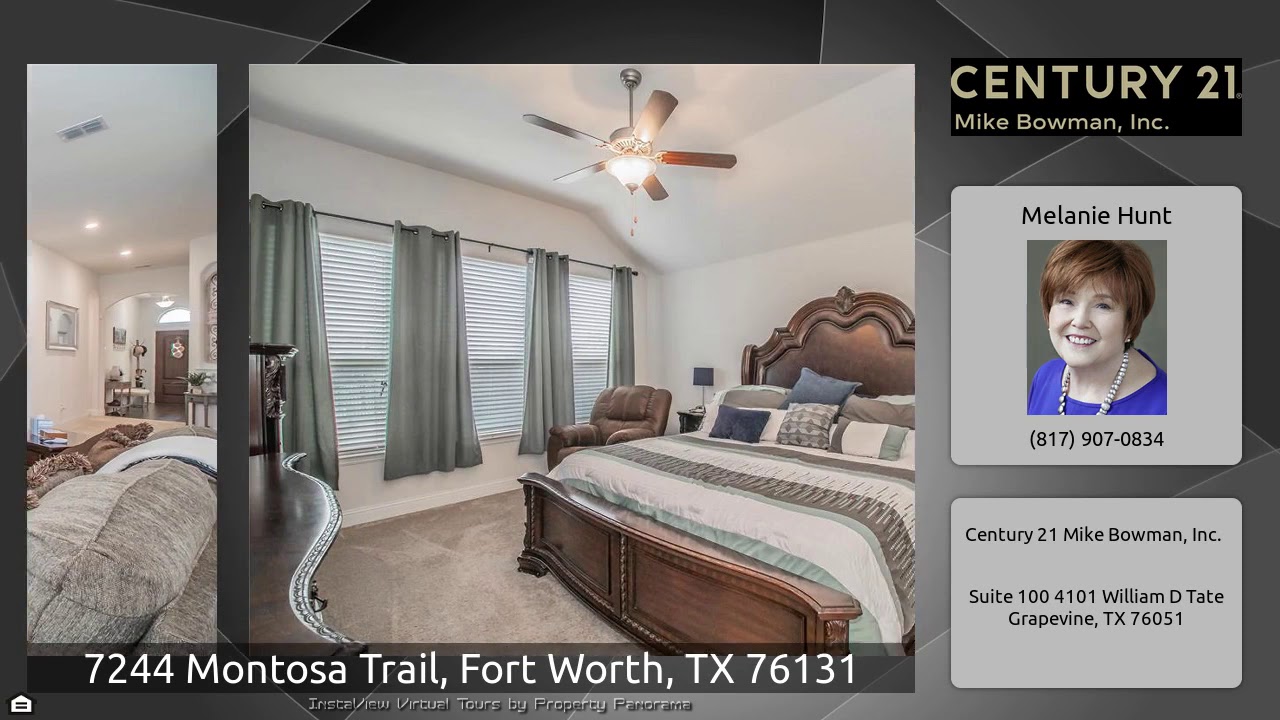The Virtual Tour for the property at 7244 Montosa Trail, Fort Worth, TX 76131 listed for $305,000: Other homes for sale by Melanie Hunt of Century 21 Mike Bowman, Inc.: Beautiful 3-2.5-2 brick home backs up to green space. Well-maintained, some landscaping, wood and metal fencing. Spacious home with specialty ceilings, arched doorways and accents, modern colors and styling. Offers elegant entry with wood floor, formal study with French doors and formal dining with large arched entry. Open plan living, kitchen and breakfast is light and bright. Decorative tile on fireplace matches kitchen …