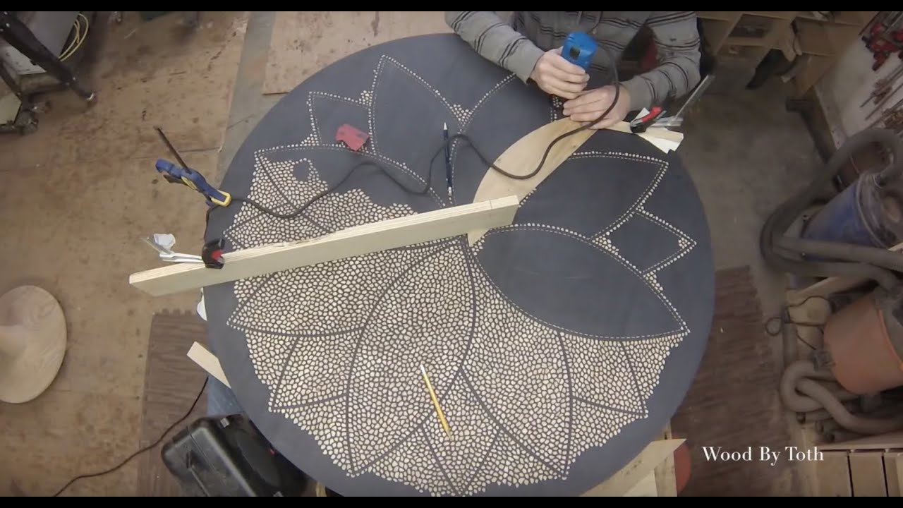 This table is made in Ash and black veneer. Its 42 inches round and 30 inches tall. The top had more than over 10,000 carved spots. This piece is for sale. If you’re interested head over to the store on my website
