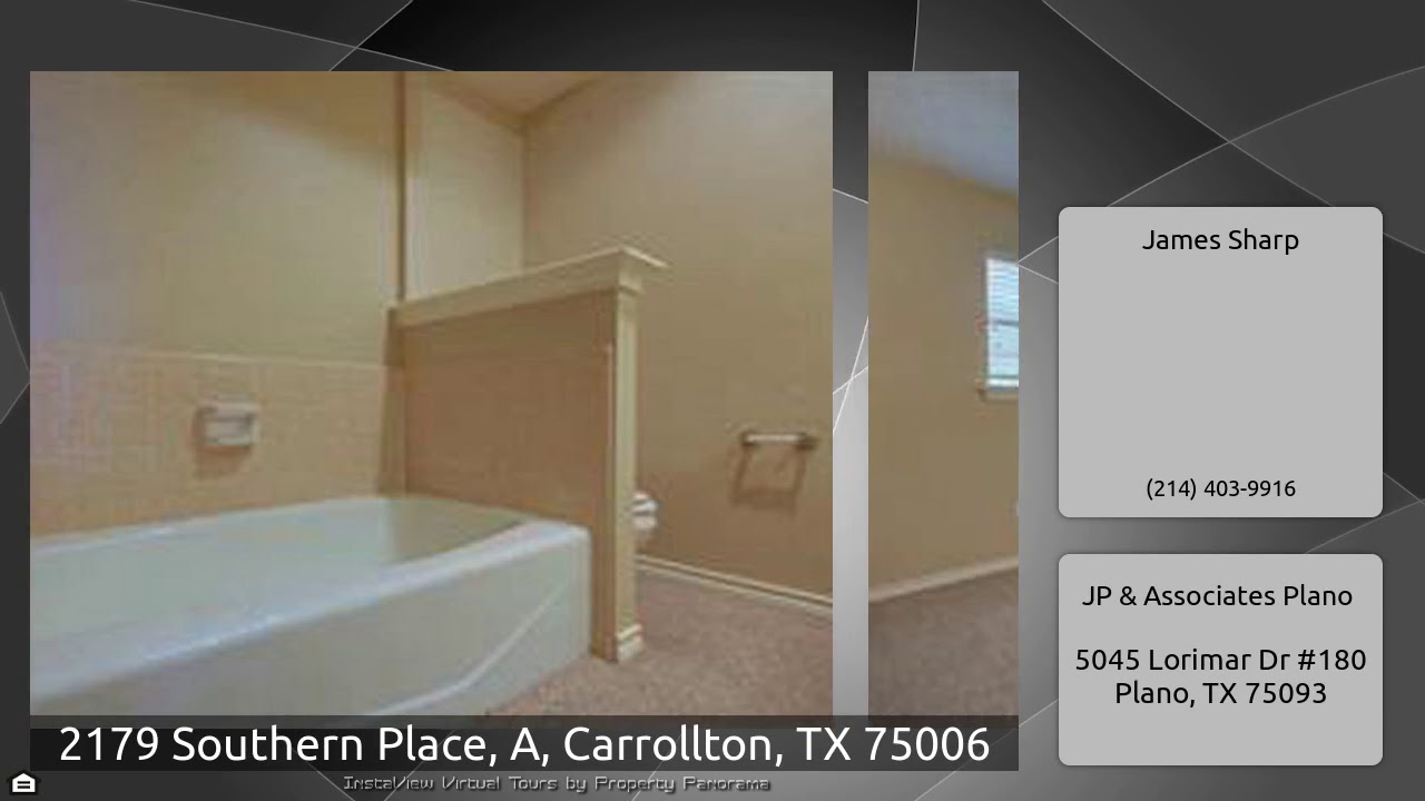 The Virtual Tour for the property at 2179 Southern Place, A, Carrollton, TX 75006 listed for $1,700: Other homes for sale by James Sharp of JP & Associates Plano: Open floor plan. Large living room features a fireplace and open to dining room. French doors lead to deck. Master bedroom has fireplace. Features fenced lot. Great neighborhood! Just a walk away from shopping at Josey and Old Denton.