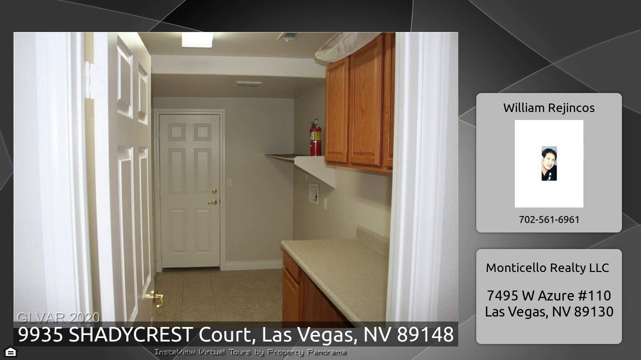 The Virtual Tour for the property at 9935 SHADYCREST Court, Las Vegas, NV 89148 listed for $459,888: Other homes for sale by William Rejincos of Monticello Realty LLC: Beautiful Home, Vaulted ceiling,New Interior two tone paint,Exterior areas painted,New baseboard, New bathroom lighting & fixtures, Ceiling fan throughout, New kitchen stainless steel appliances,sink & faucet,Large Island granite counter,Double wall ovens,Gas Fireplace,Custom French doors, Den with Built In & Upstairs Loft area,Two dining rooms,Large Laundry room & cabinets.Large cover patio & Custom patio door,New stucco painted …