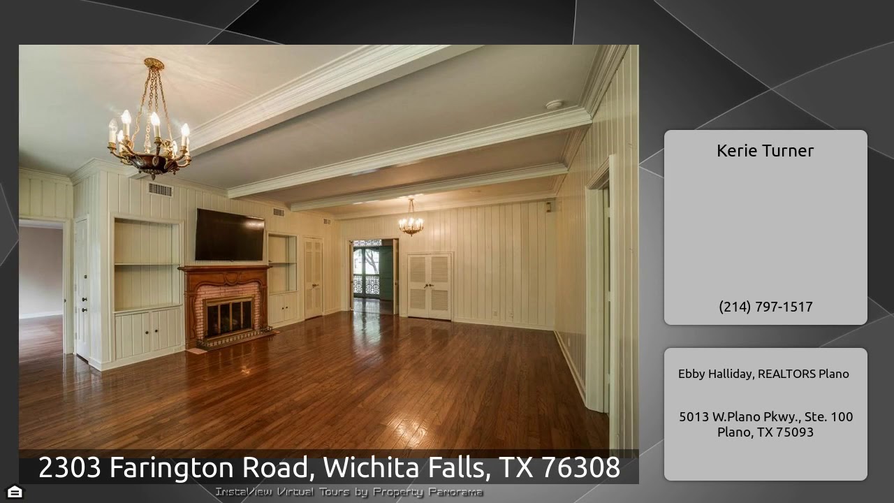 The Virtual Tour for the property at 2303 Farington Road, Wichita Falls, TX 76308 listed for $359,000: Other homes for sale by Kerie Turner of Ebby Halliday, REALTORS Plano: Beautiful Sanderforth custom-built home in desirable County Club Estates. This was the builder's personal home. One-of-a-kind Country French home with 4 bedrooms, 3.1 baths, 2 living areas, 2 dining areas, oversized garage & covered carport in back. Extra-large rooms, custom trim work throughout, wood flooring in living, family & dining. Brick flooring in kitchen, breakfast, laundry & hallway. Plantation shutters, bay …
