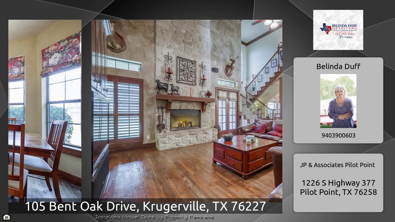 The Virtual Tour for the property at 105 Bent Oak Drive, Krugerville, TX 76227 listed for $524,500: Other homes for sale by Belinda Duff of JP & Associates Pilot Point: Everything Your FAMILY Could Ask For! Stunning 4 Bedroom Custom Built HOME offering 2 Dining Areas, a OFFICE with French Doors, 3.5 Baths, and a spacious GAME ROOM upstairs! Plus a built in DESK with CABINETS upstairs & downstairs! A great HOME for entertaining FAMILY & FRIENDS! Hand Scraped Hard Wood Flooring, Beautiful STONE Fireplace, Plantation Shutters, & a River Rock Walk In Shower! ENJOY the 20×30 Metal Shop~Mancave …