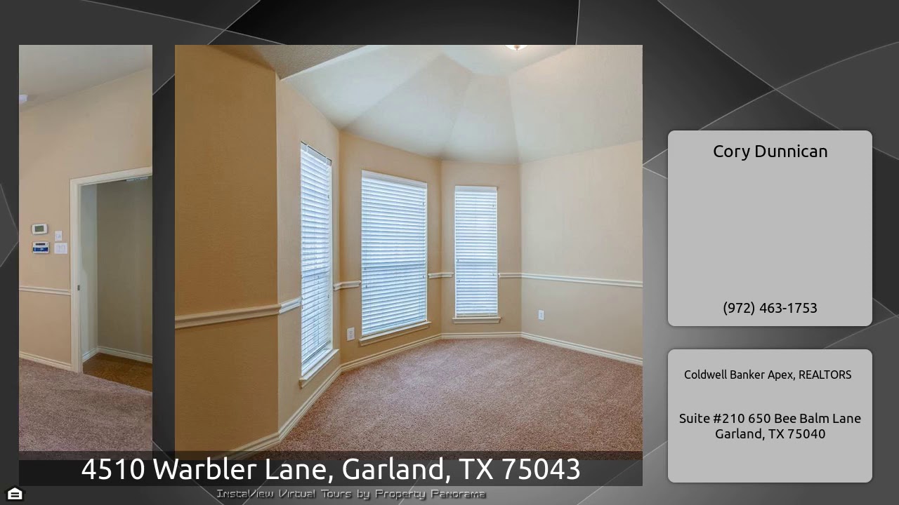 The Virtual Tour for the property at 4510 Warbler Lane, Garland, TX 75043 listed for $335,000: Other homes for sale by Cory Dunnican of Coldwell Banker Apex, REALTORS: The one you've been waiting for…a stunning home inside & out! A gorgeous entry with gleaming hardwoods, a home office with stained French Doors & moldings, a spacious formal dining with extensive moldings opening to a butler's pantry & huge walk-in pantry. The family room showcases a stone fireplace, wall mounted flat screen & opens to the casual dining area & breakfast bar. The kitchen boasts granite countertops, stainless …