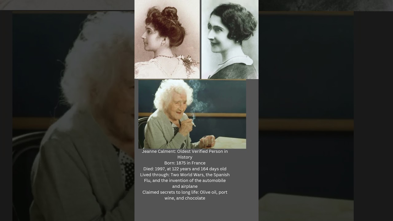 Meet Jeanne Calment, the French supercentenarian who holds the Guinness World Record for the oldest verified person in history. In this YouTube short, we delve into the extraordinary life of a woman who witnessed over a century of change, from meeting Vincent van Gogh as a young girl to outliving her own children. Despite her legendary longevity, her lifestyle was surprisingly relaxed, filled with port wine, chocolate, and cigarettes. Discover the secrets behind her incredible journey and the wisdom she shared along the way. #JeanneCalment #Longevity #GuinnessWorldRecord #Supercentenarian #OldestPerson #History #France #Aging #AmazingFacts