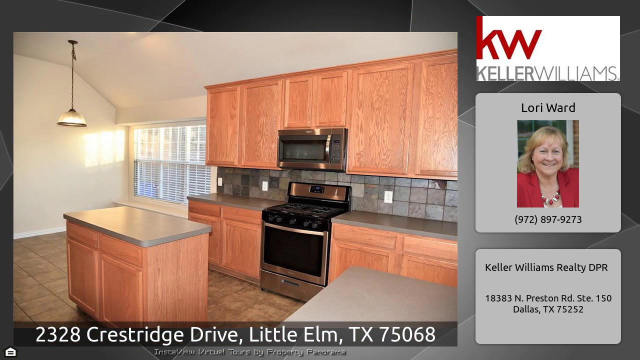 The Virtual Tour for the property at 2328 Crestridge Drive, Little Elm, TX 75068 listed for $2,100: Other homes for sale by Lori Ward of Keller Williams Realty DPR: For Lease only – Beautiful one story home with special touches. Formal dining and family elegant laminate wood floors. Handsome study with french doors, Island kitchen with tile floors, breakfast bar, slate backsplash and abundant cabinet space. Large family room with vaulted ceilings and fireplace. Large master with bay windows. Floored attic above garage for additional storage. Master and BR 4 are open as one large room, can …