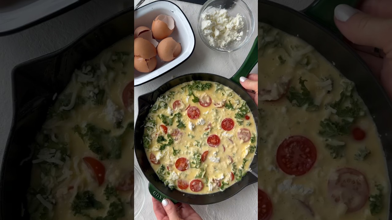 @wardehihsan8705 5 months ago 4 eggs SaltWhip creamWisk it togetherPut oil on baking panAdd kale Add cherry tomatoes Add the whisked eggs Add goat cheese Add mozzarella