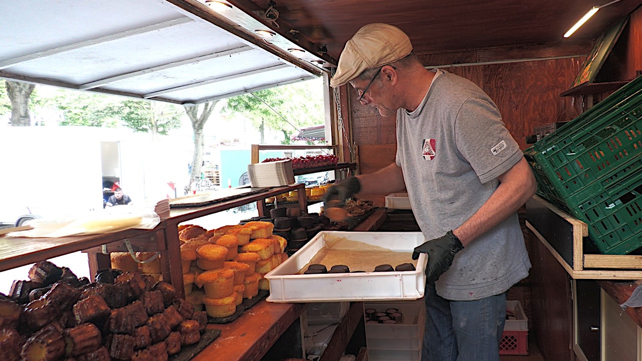 “The Great One-Man Bakery on the Market” is the continuation of Olivier’s renowned French baking tradition, which we’d like to introduce in this Episode of “Street Food Berlin Germany.” Besides Croissants, Pain au Chocolat, and Cheesecakes with Mango-Passion Fruit Topping, Cannelés Bordelais, and dreams come true like Raspberry-Mascarpone Cream-filled Fruit Sticks covered in white Chocolate, or Chocolate Financiers with Blackcurrant Puree, Pastry-Style Vanilla Cream with Mascarpone, and Pistachio Topping, Olivier offers all sweet-toothed delights at the Market. Of course, everything is homemade, as shown in detail in Part 1. Olivier loves the Market & the People, and his happy Customers love his delicious Cakes and Pastries—because “sweet things make you happy!”