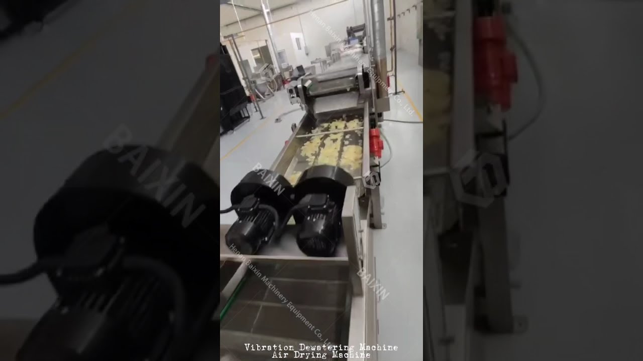 Process flow of potato chips includes:Fresh raw potato—Pre-washing and sinking stone—Peeling and washing—Manually picking —Cutting chips—Drum washing chips—Bubble washing starch—Hot water blanching—Vibrating remove water—Air dryer dewatering—Hot air drying—Hot oil frying—Vibrating remove oil—Air drying deoiling—Seasoning—Weighing and packing—Metal detection—Bag organization—Box packing and sealing