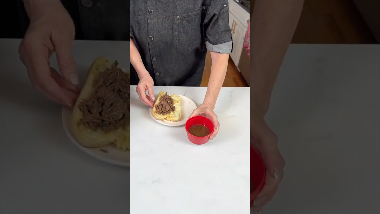4. Transfer the roast and shred it with a fork or slice it against the grain into thin slices. Reserve the beef broth mixture and skim the fat from the surface.