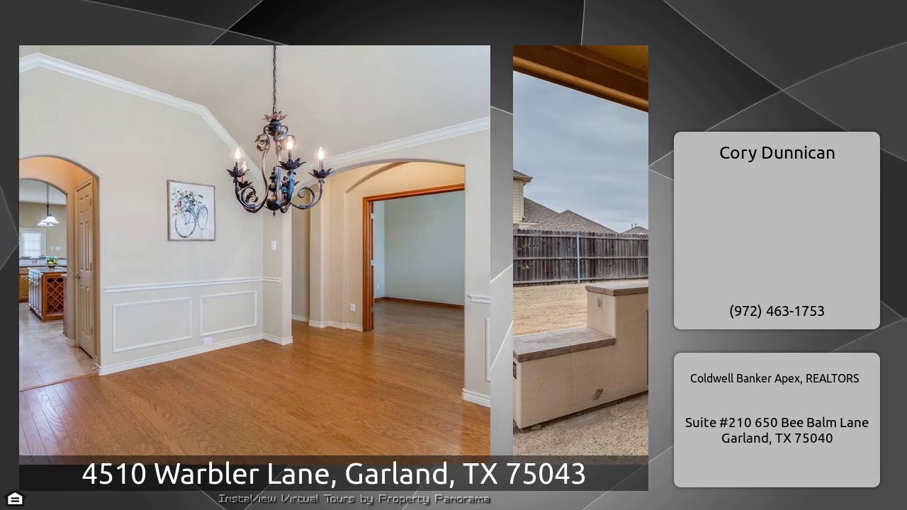 The Virtual Tour for the property at 4510 Warbler Lane, Garland, TX 75043 listed for $335,000: Other homes for sale by Cory Dunnican of Coldwell Banker Apex, REALTORS: The one you've been waiting for…a stunning home inside & out! A gorgeous entry with gleaming hardwoods, a home office with stained French Doors & moldings, a spacious formal dining with extensive moldings opening to a butler's pantry & huge walk-in pantry. The family room showcases a stone fireplace, wall mounted flat screen & opens to the casual dining area & breakfast bar. The kitchen boasts granite countertops, stainless …
