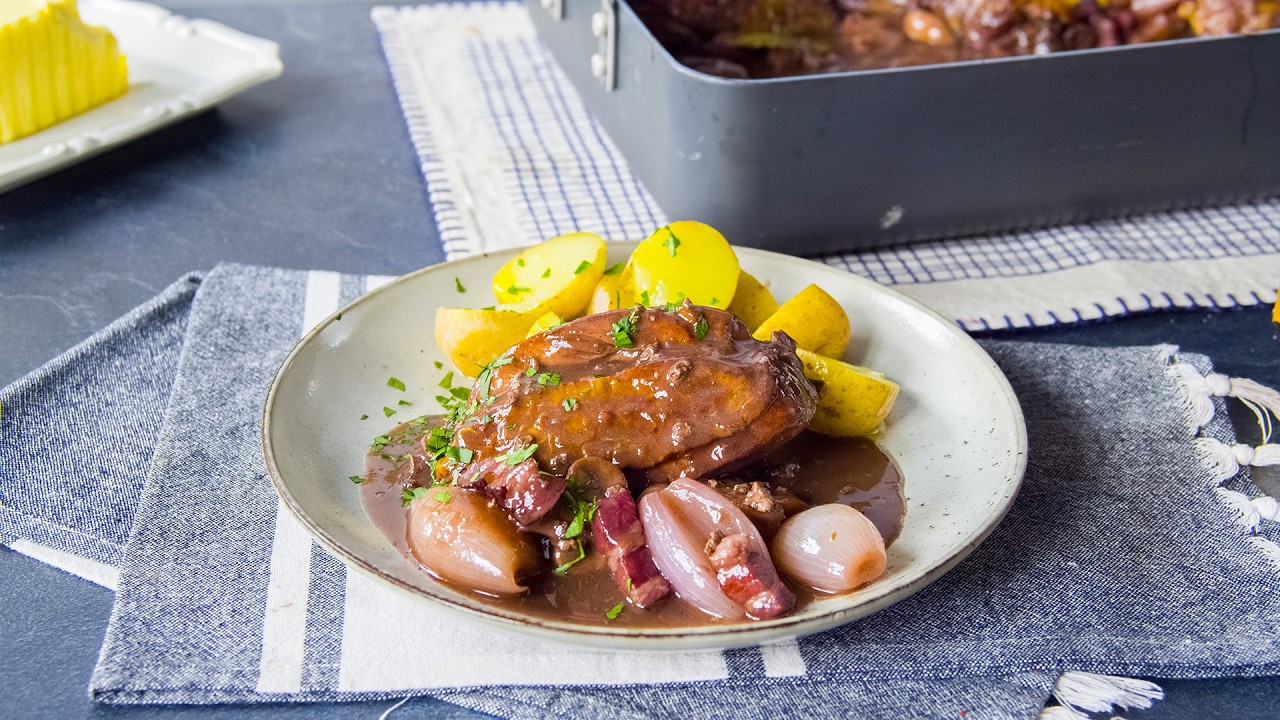 Winter calls for this deeply savory, wine-braised chicken stew. It’s one of Julia Child’s signature dishes and inspired by the French classic, coq au vin. This version is a simpler, holiday friendly way to make a fancy dish that keeps all the traditional flavors of the recipe with easier-to-find ingredients. The red wine sauce is enriched with a smoky depth of cognac and tender bites of chicken, crispy bacon, and mushrooms, slow-cooked to perfection. Try it for your next holiday gathering or dinner!