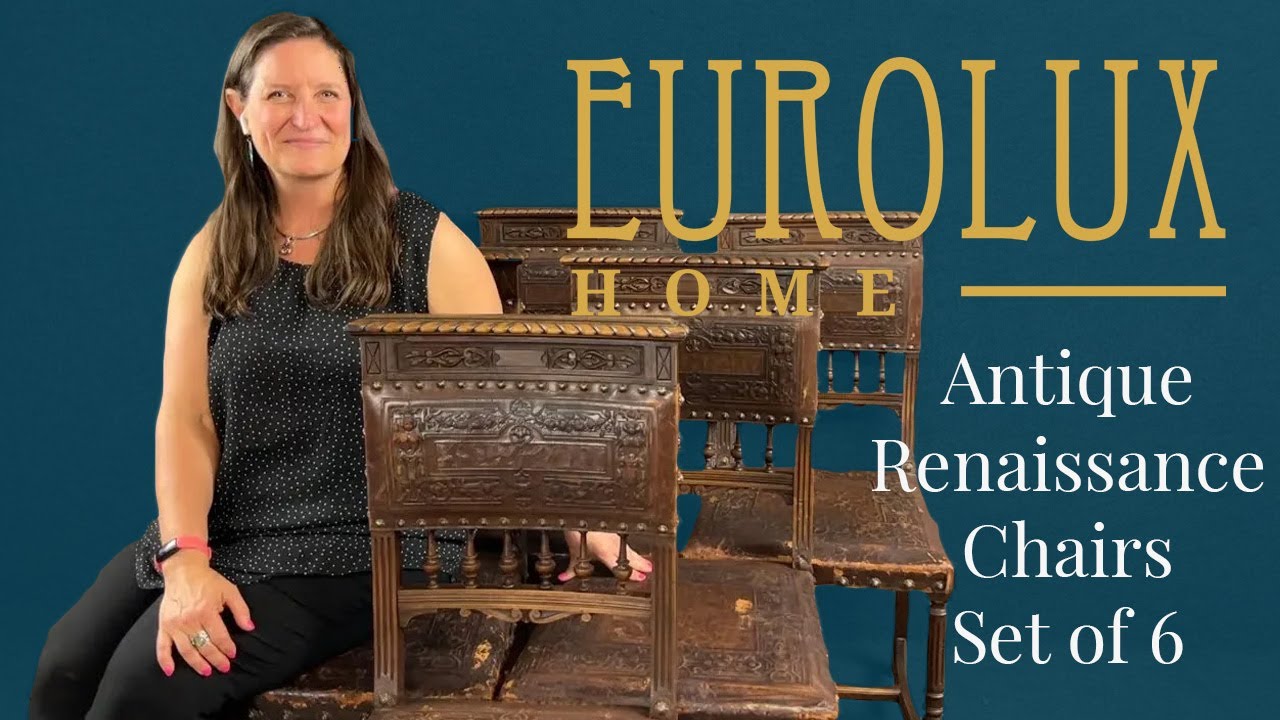 Explore this beautiful set of Renaissance style antique dining chairs (27-3) dating to around 1890. In this video, Aimee from EuroLux Home highlights the artistry and craftsmanship of these hand-carved walnut chairs, showcasing the detailed carvings, rich patina, and original embossed leather seats that make this set truly special.