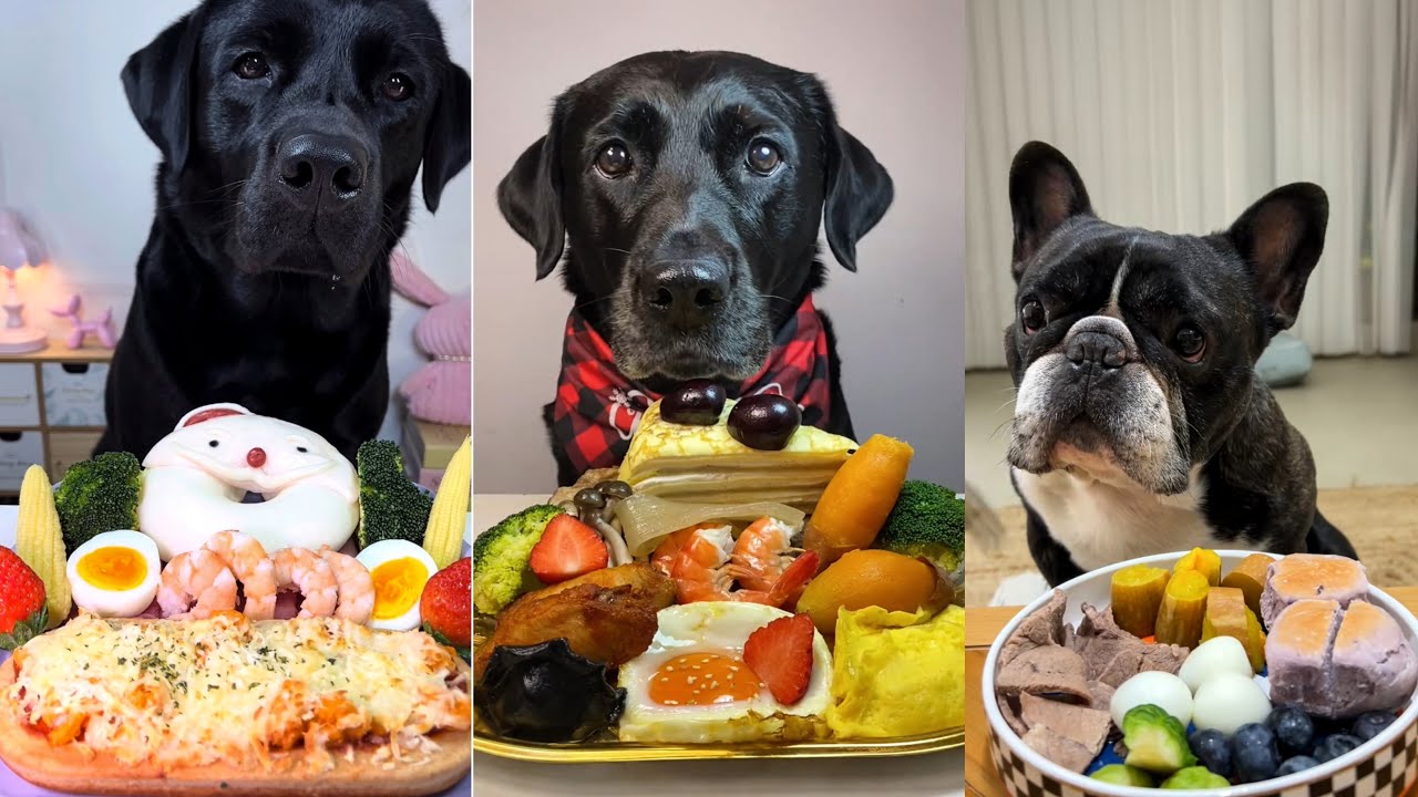 In today’s Christmas Special Dog Food Challenge, two playful Black Labradors and one adorable French Bulldog enjoy a festive feast filled with seafood, eggs, fruits, vegetables, and healthy treats.