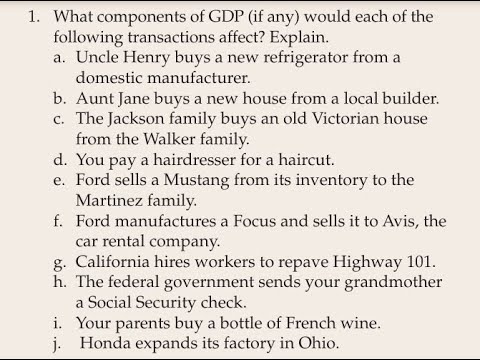 What components of GDP (if any) would each of the following transactions affect? Explain. a. Uncle Henry buys a new refrigerator from a domestic manufacturer. b. Aunt Jane buys a new house from a local builder. c. The Jackson family buys an old Victorian house from the Walker family. d. You pay a hairdresser for a haircut. e. Ford sells a Mustang from its inventory to the Martinez family. f. Ford manufactures a Focus and sells it to Avis, the car rental company. g. California hires workers to repave Highway 101. h. The federal government sends your grandmother a Social Security check. i. Your parents buy a bottle of French wine. j. Honda expands its factory in Ohio.