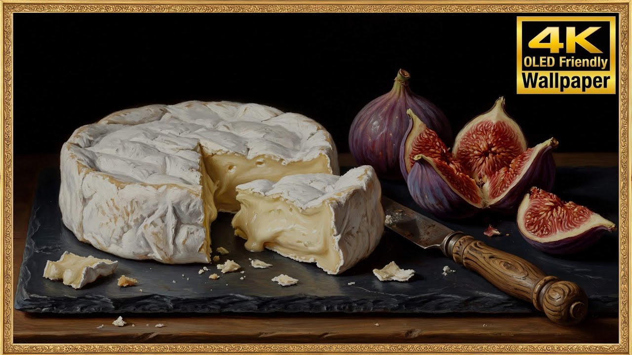 Feast your eyes on this delectable arrangement of gourmet delights. A wheel of creamy Brie cheese, paired with ripe, open figs and a rustic knife on a slate board, offers a sensory experience of texture and color.This 4K TV art is perfect for kitchens and dining rooms. The hyper-realistic details of the cheese rind and the vibrant flesh of the figs make the image pop, creating an appetizing and sophisticated focal point.Enhance your dining atmosphere with this aesthetic background. It celebrates the simple pleasures of food, providing a relaxing and cultured vibe that complements a modern or rustic interior perfectly.