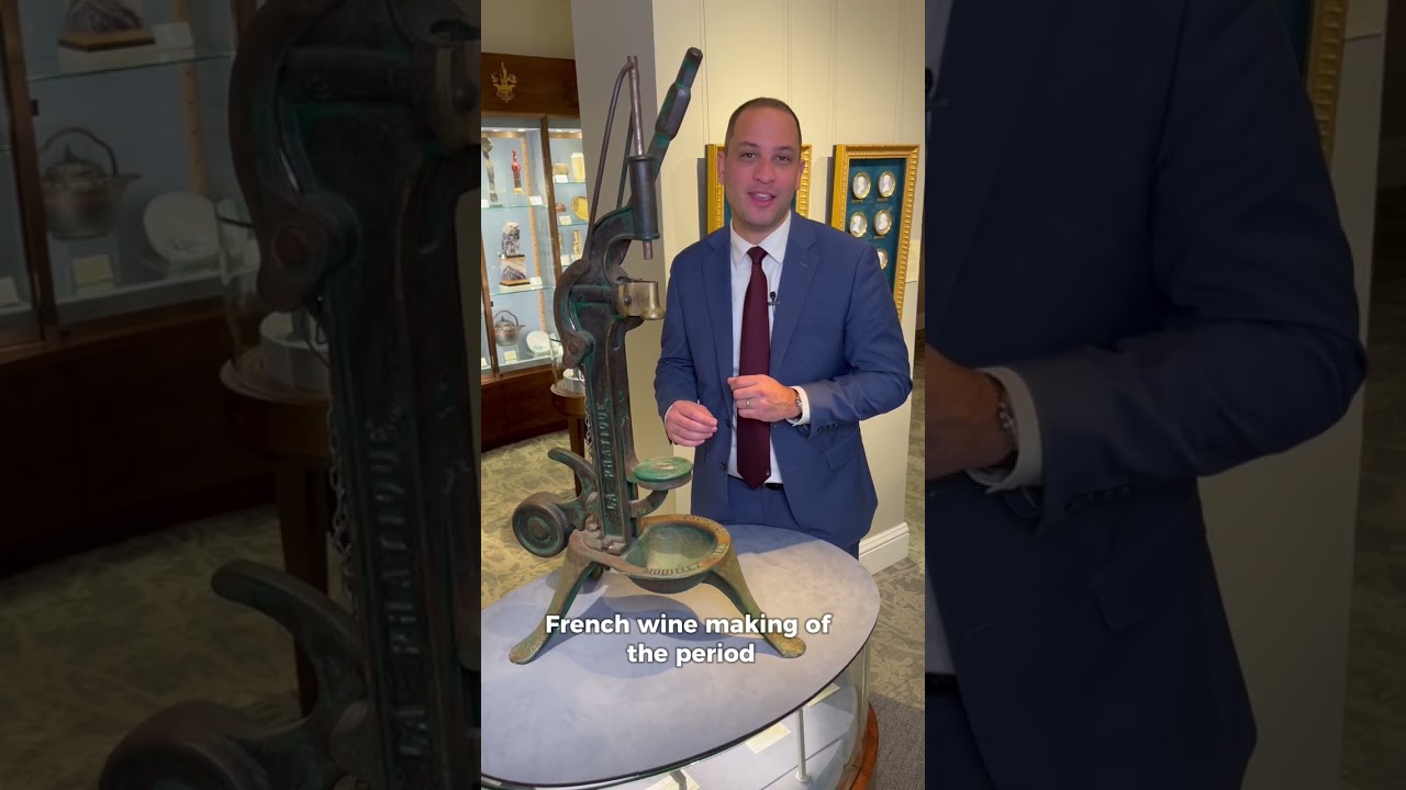 The fine art of wine-making is brought to life by this rare French wine corker. Beautifully crafted of wrought iron, this corker is specifically designed for ease of use. One by one, a bottle is placed on the iron platform, while a weighted lever cranks down to plunge a cork into the bottle. Any wine that spilled over was collected in the basin underneath. Most corkers were hand-held or sat on floors or table tops; seated models such as this are extremely rare. The base bears the instructions “mouillez les bouchons”, meaning “wet the corks.” Mechanically advanced yet endearingly rustic, this corker perfectly embodies the time-honored traditions of exceptional French wine-making.