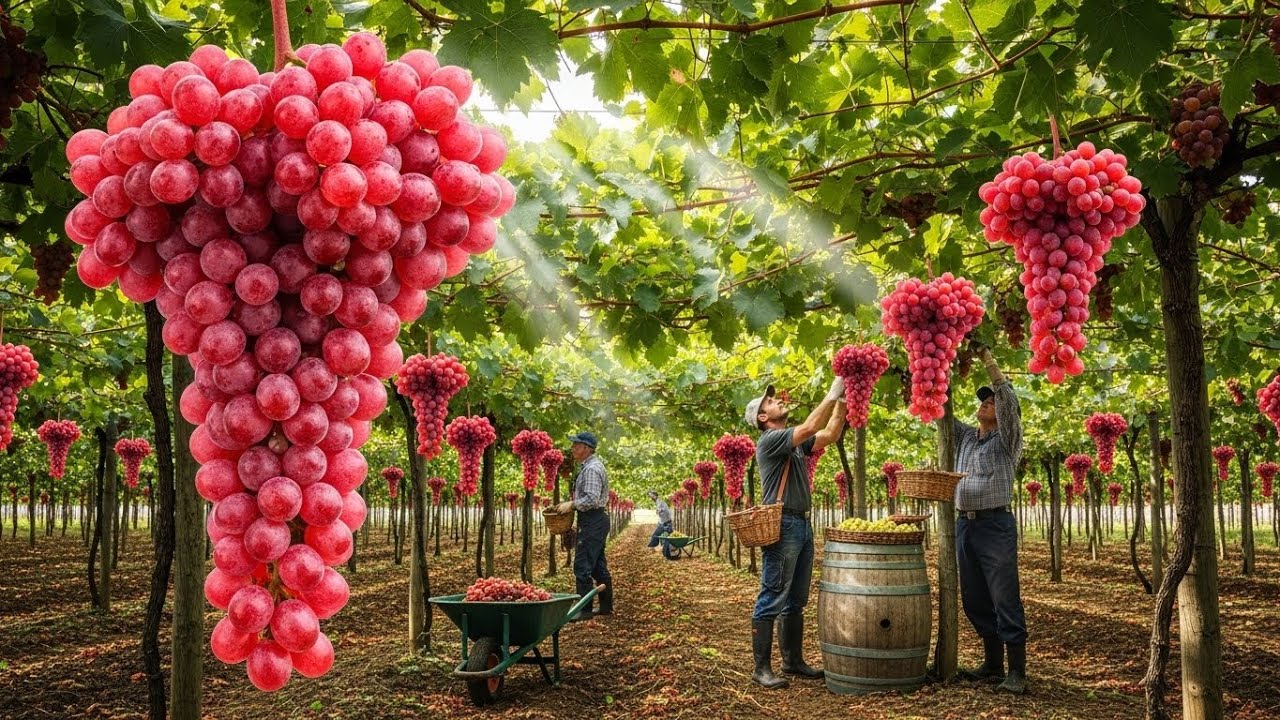 Welcome to an endless vineyard where giant pink grape clusters hang in long rows as far as you can see! In this video, we follow farmers harvesting grapes—from picking to loading carts—capturing an unreal, satisfying grape harvest vibe.