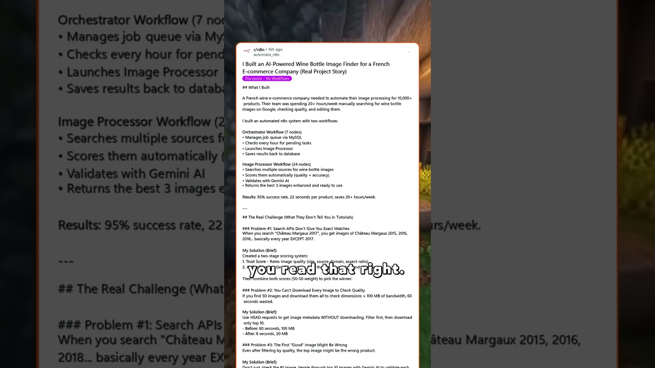 A French wine company was manually searching for wine bottle images 20 hours a week! Discover how I built an AI-powered n8n system to completely automate this incredible time-sink, transforming their e-commerce workflow and saving countless hours.