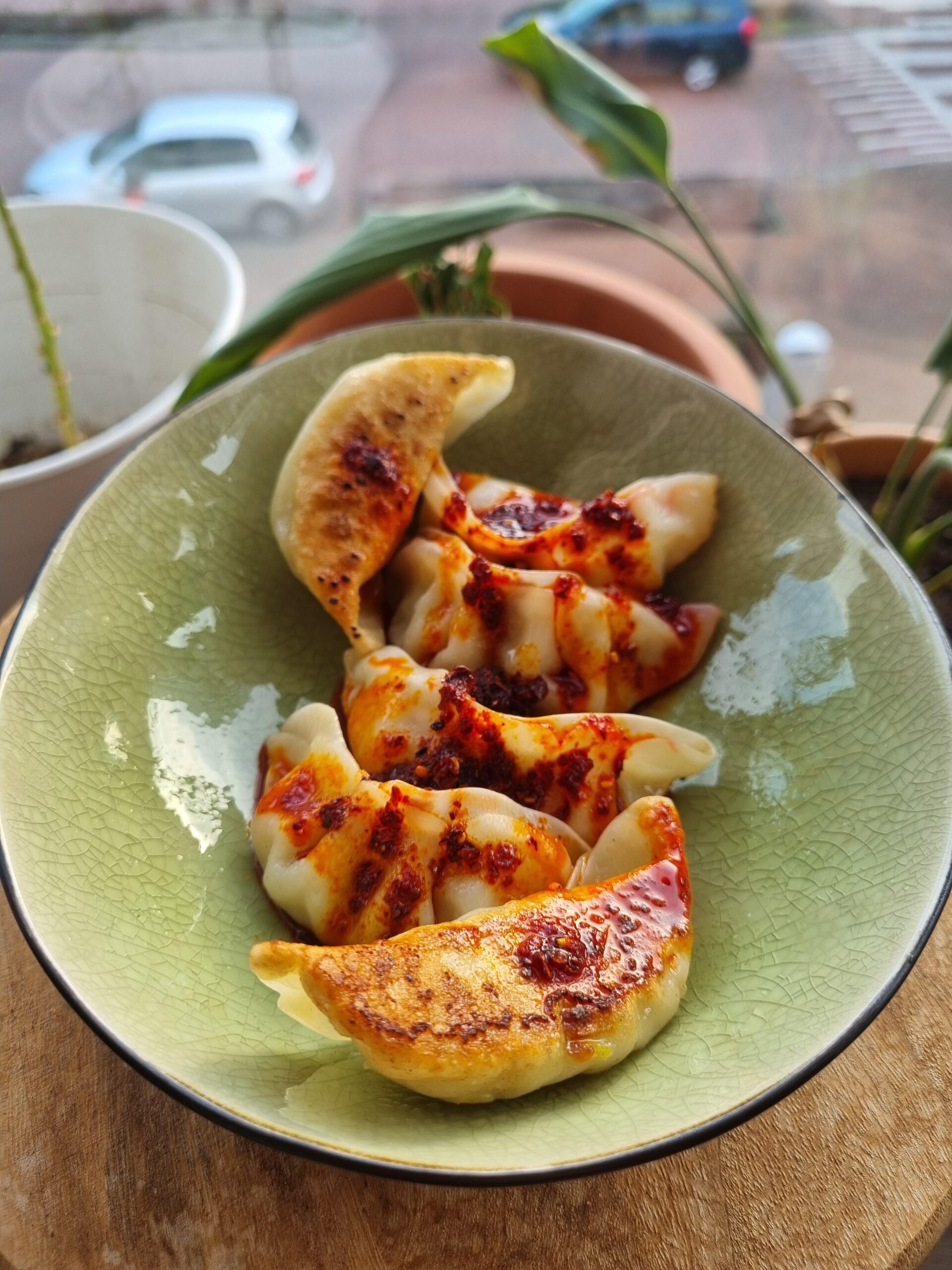 Serving recommendation – use the chilli oil, together with soy sauce and ideally rice vinegar (apple vinegar with a less pungent smell would also work) to make a dip. Pour the three in a small plate and dip the gyoza – this is how it’s served in Japan, and the umami is great. Congrats on the nice crispiness!