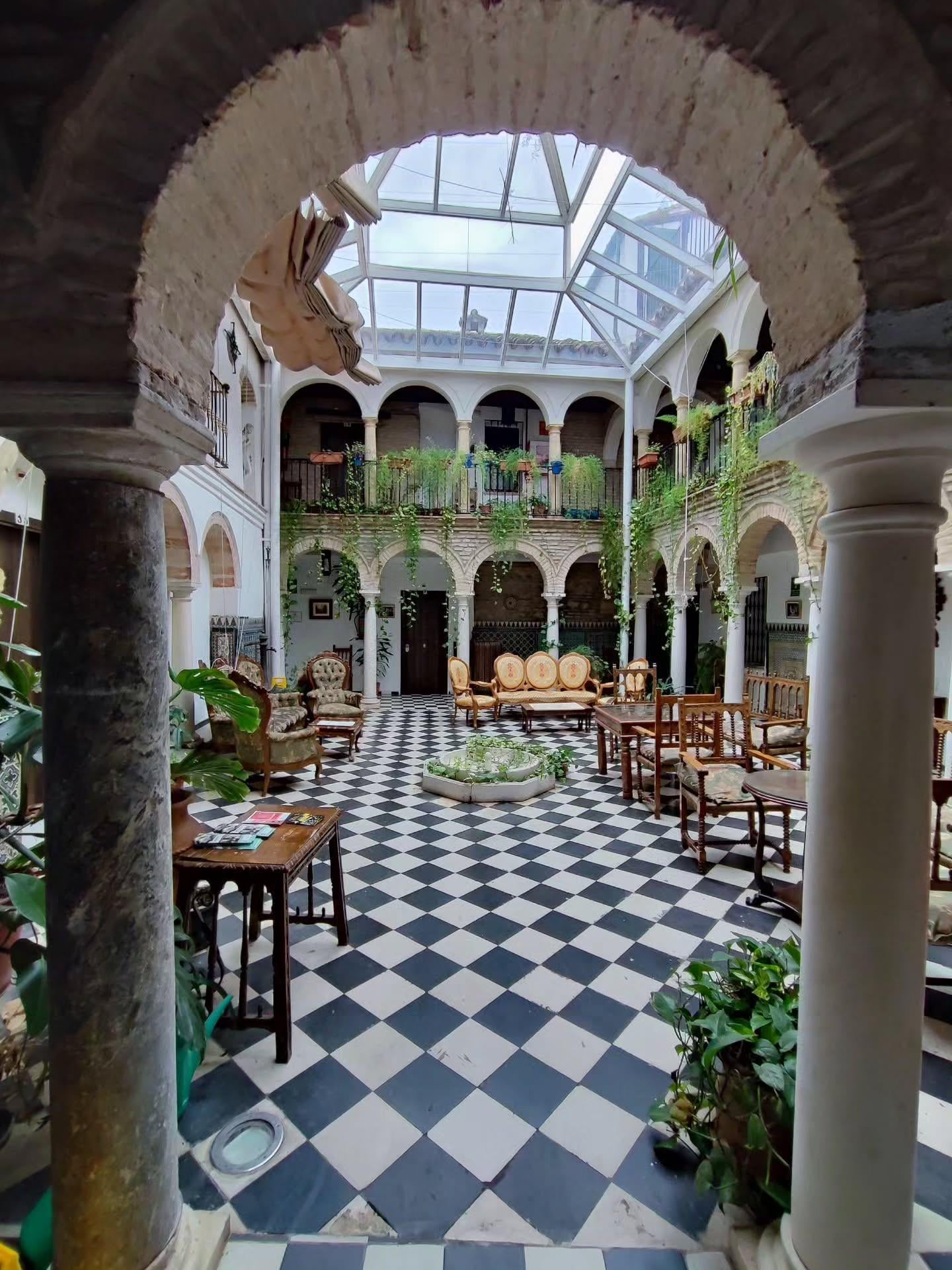 I stayed here for a night last spring and the courtyard was hands down the best feature. The glass roof lets the Andalusian light pour in without the heat cooking you alive, and the tile at the base of the columns bounces a soft green glow onto the white walls at sunset. I loved the little runnel that feeds the fountain too – between the moving water and the thick stone walls the air stays surprisingly cool even at midday. If I ever get the chance to design student housing, I am stealing this exact covered patio idea.