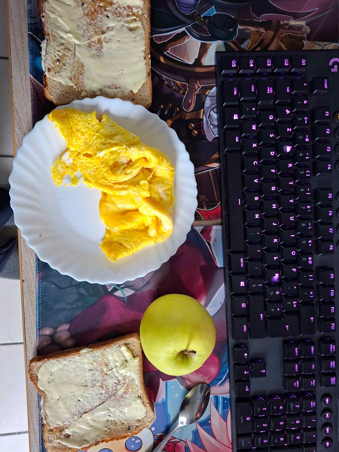 mais sinon oeufs brouillé + 2 tartines grilles, beuré et salé et une pomme
