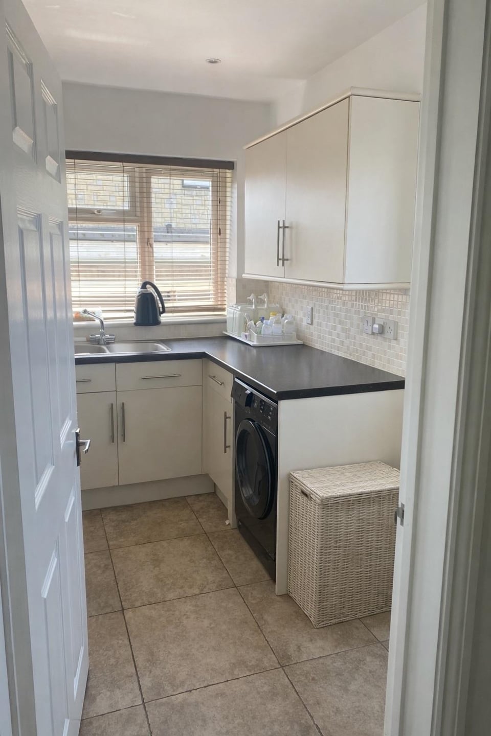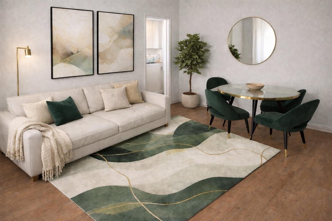 To add: large plant, mirror above dining table, white storage (cabinets / shelves) for a brighter, cohesive look across the home