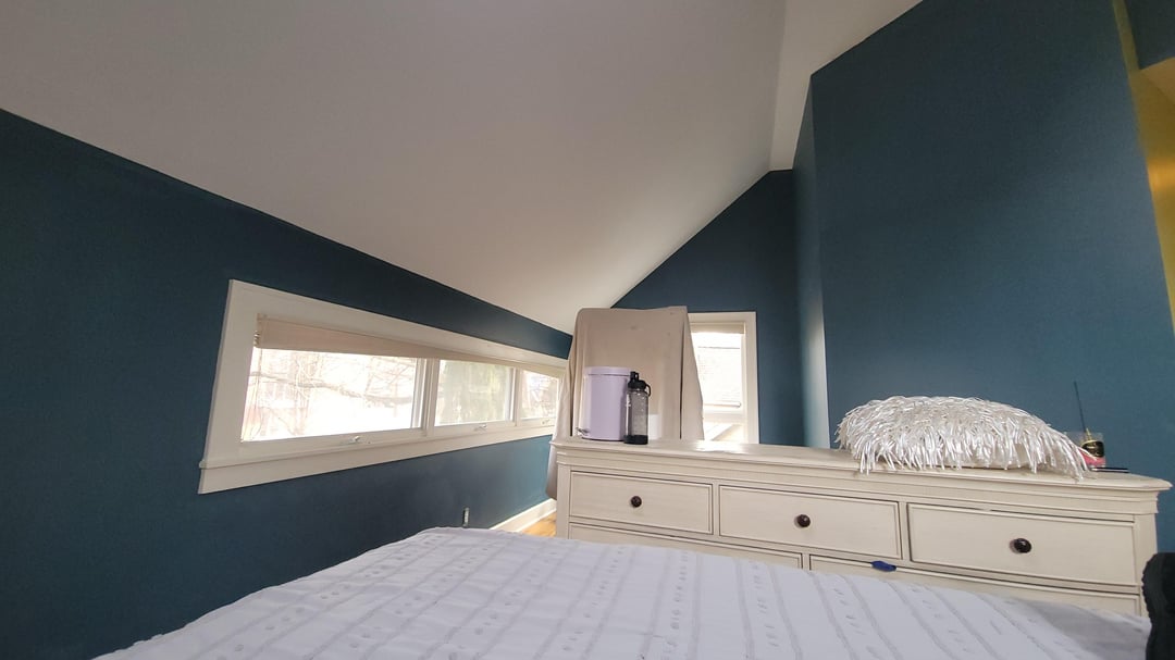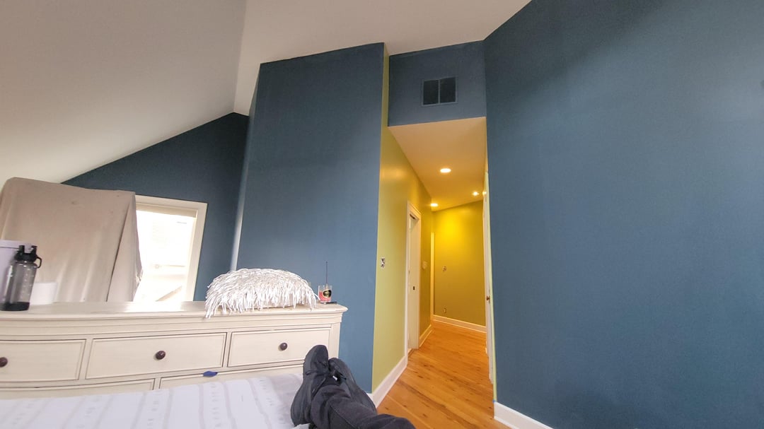 What kind of mood were you going for? The blue in the bedroom is quite bold. If the whole room were blue, I’d choose all white furniture with highly textured linens and a few blue and black accents – probably the bedside lamps). Goal would be to tone it down because calm bedrooms are good for sleep. If instead you want a dramatic look, you could go for all black furniture, with dark blue textiles – many different shades of blue, to create an analogous color scheme. Would color drench it in that case.