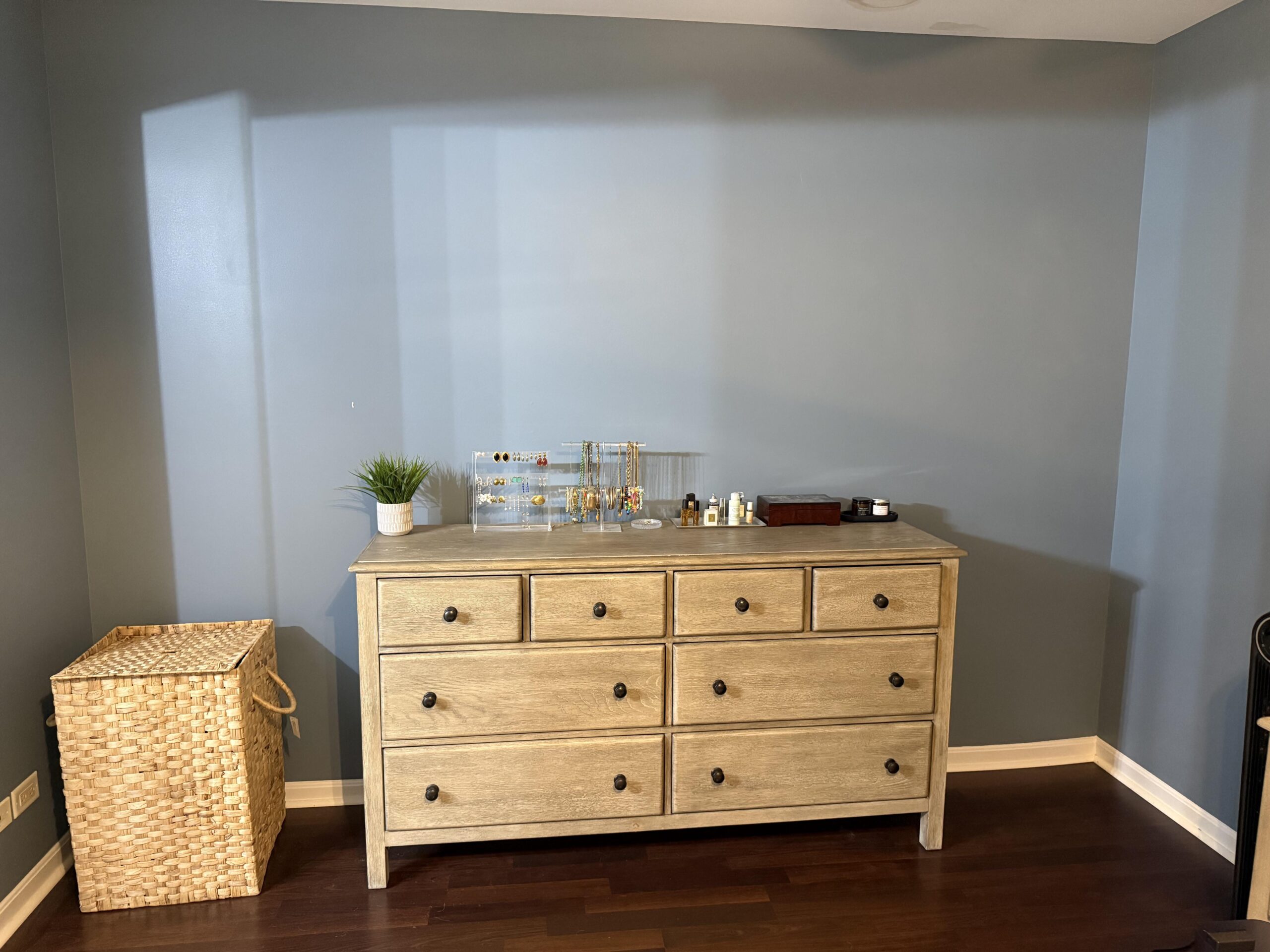 Paint the walls, add a mirror above the dresser. Get an air purifier if you don’t have one.