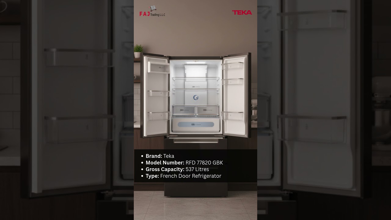 The new Teka RFD 77820 is a large 537L French Door fridge freezer featuring an energy-efficient Inverter Motor, No Frost with three independent cooling circuits for optimal freshness, and advanced features like TempGuard Radar for precise temperature control, IonClean for bacteria elimination, and a specialized Gourmet Box for meat/fish with touch control. Key aspects include its sleek design, LED lighting, humidity-controlled drawers, and user-friendly electronic controls for independent compartment temperature management. Now available exclusively at F A J Trading L.L.C.