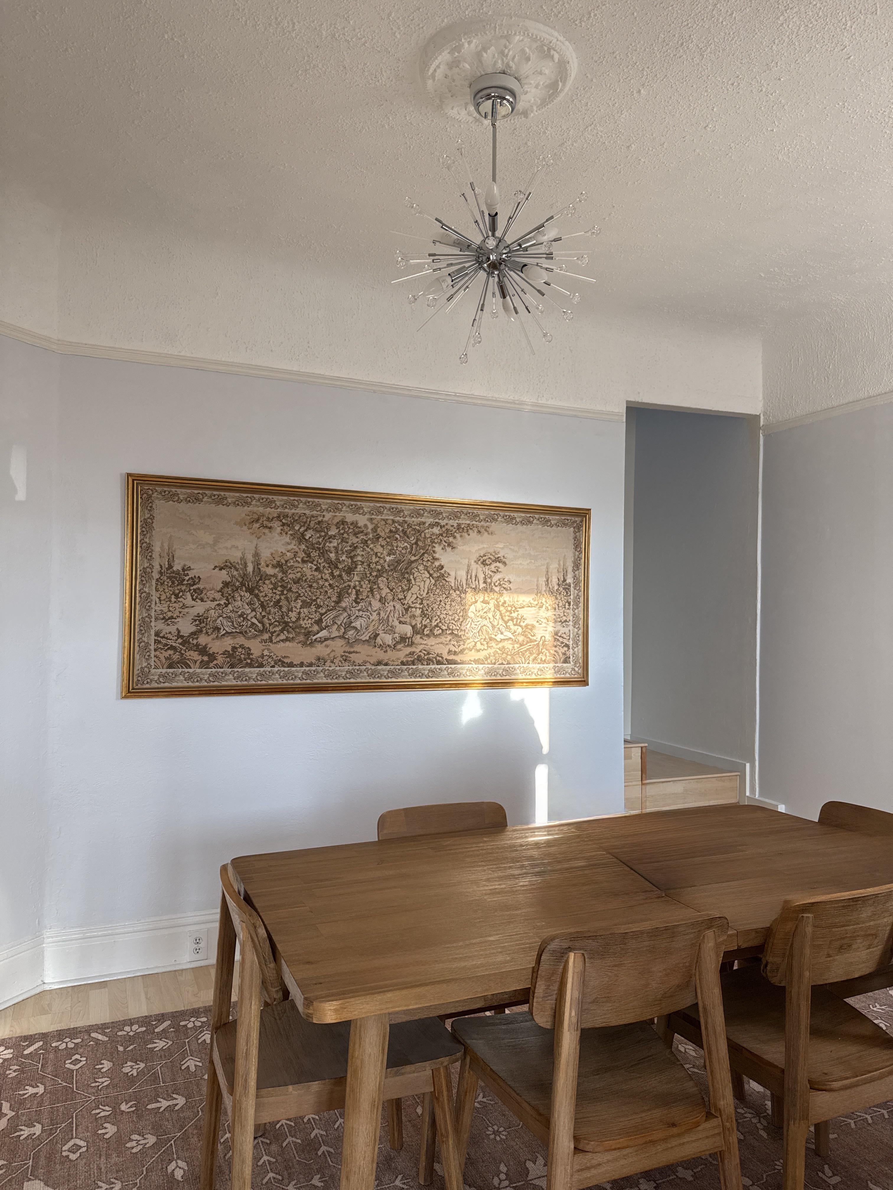 Considering adding a narrow console table or maybe a picture light above this art piece. For perspective, the art piece is 7’ x 3’ so it’s quite large. Kind of feels like it’s floating right now…