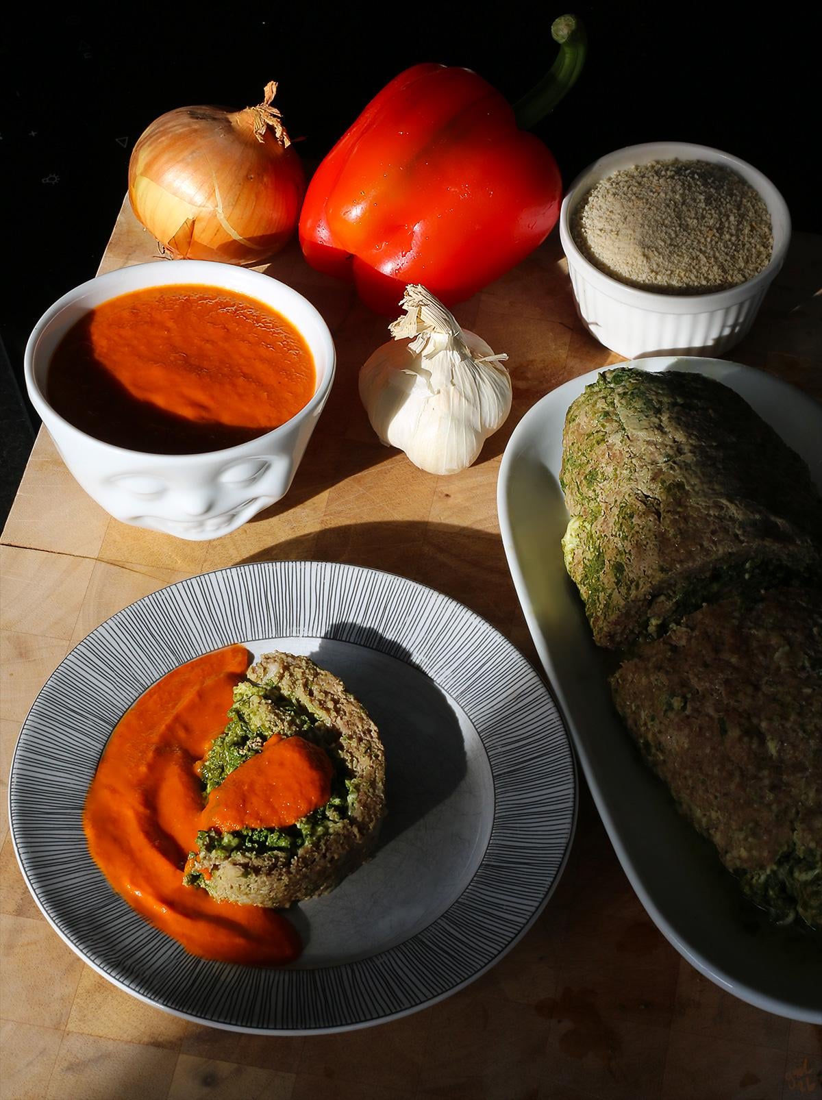 Mon premier pain de viande ! J'ai galéré à le faire 'tenir' à la cuisson, car cette recette propose une version où l'appareil -de mélange viande, fromage, ail, oignon et chapelure-, se roule comme une sorte de buche avec des épinards à l'intérieur 🙂 La sauce est un mix' de poivrons rouge grillé, sauce tomate, ail et feuilles de basilic. C'était vraiment excellent ! Une petite photo pour la tranche et non le pain informe à côté haha !