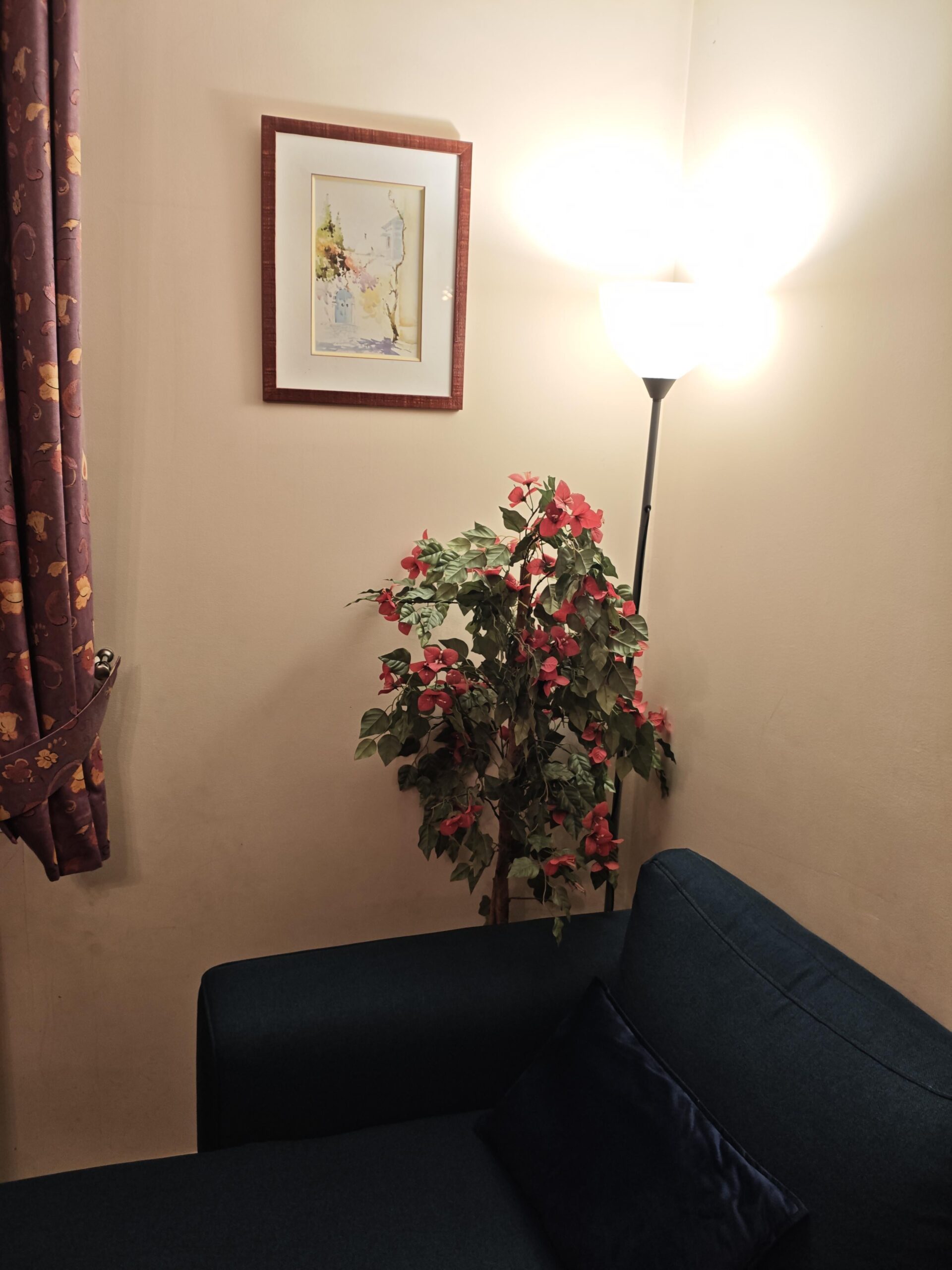 The tree looks very fake. The curtains are dated. The lamp is boring and looks flimsy. The art is fine but a larger piece would look better in that spot. Overall, this looks like a corner in a nursing home.