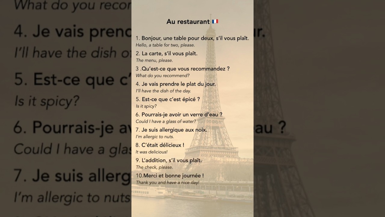 Learn how to speak like a local in a French restaurant! 🍽️ From ordering a table to asking for the check, these 10 phrases will make your dining experience smooth and fun. French phrases + English translation – perfect for beginners! CuisineDiningEssentialFranceFrenchfrench cuisineFrench diningphrasesrestaurantVideoVlogYouTubeWrite A CommentYou must be logged in to post a comment.