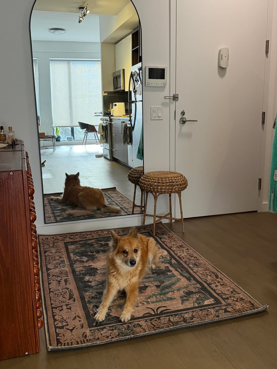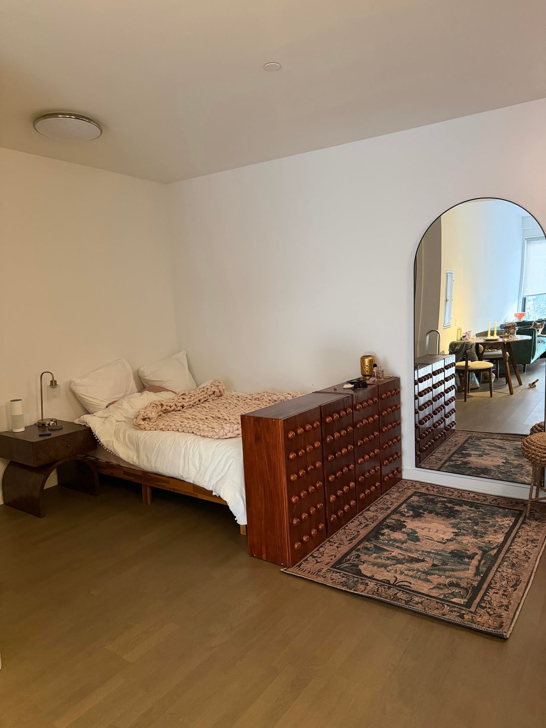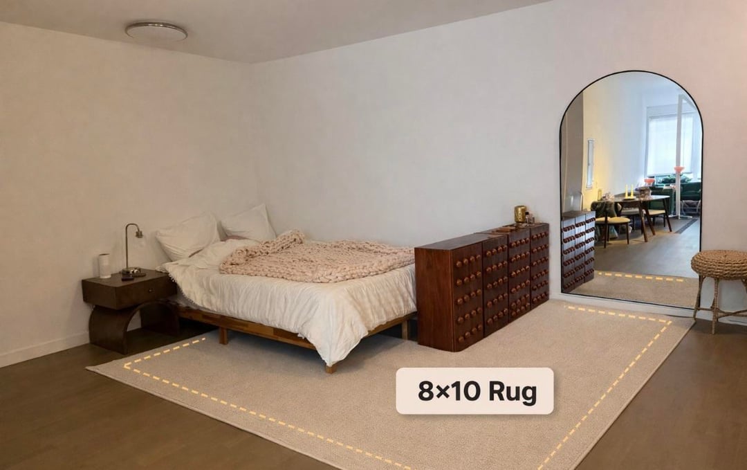 I live in a studio and put my bed by the entrance. I originally got a 5×7 rug to visually separate the entry way area from my bed. But I can’t decide if that looks off. Considering exchanging for a 8×10 because it looks better but I don’t like how it reads as one continuous zone vs bed + entryway. I was also considering getting a second rug to put under my bed but think it would clash.