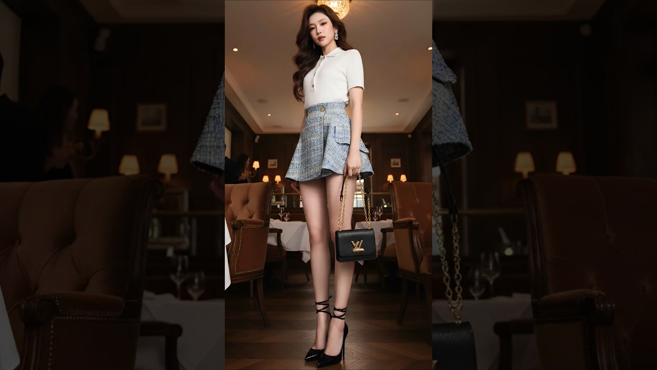 She wears a Louis Vuitton Monogram Piqué Polo Top (Black or White) paired with a Tweed Mini Wrap Skirt, creating a Parisian-inspired silhouette that blends elegance with youthful charm.
