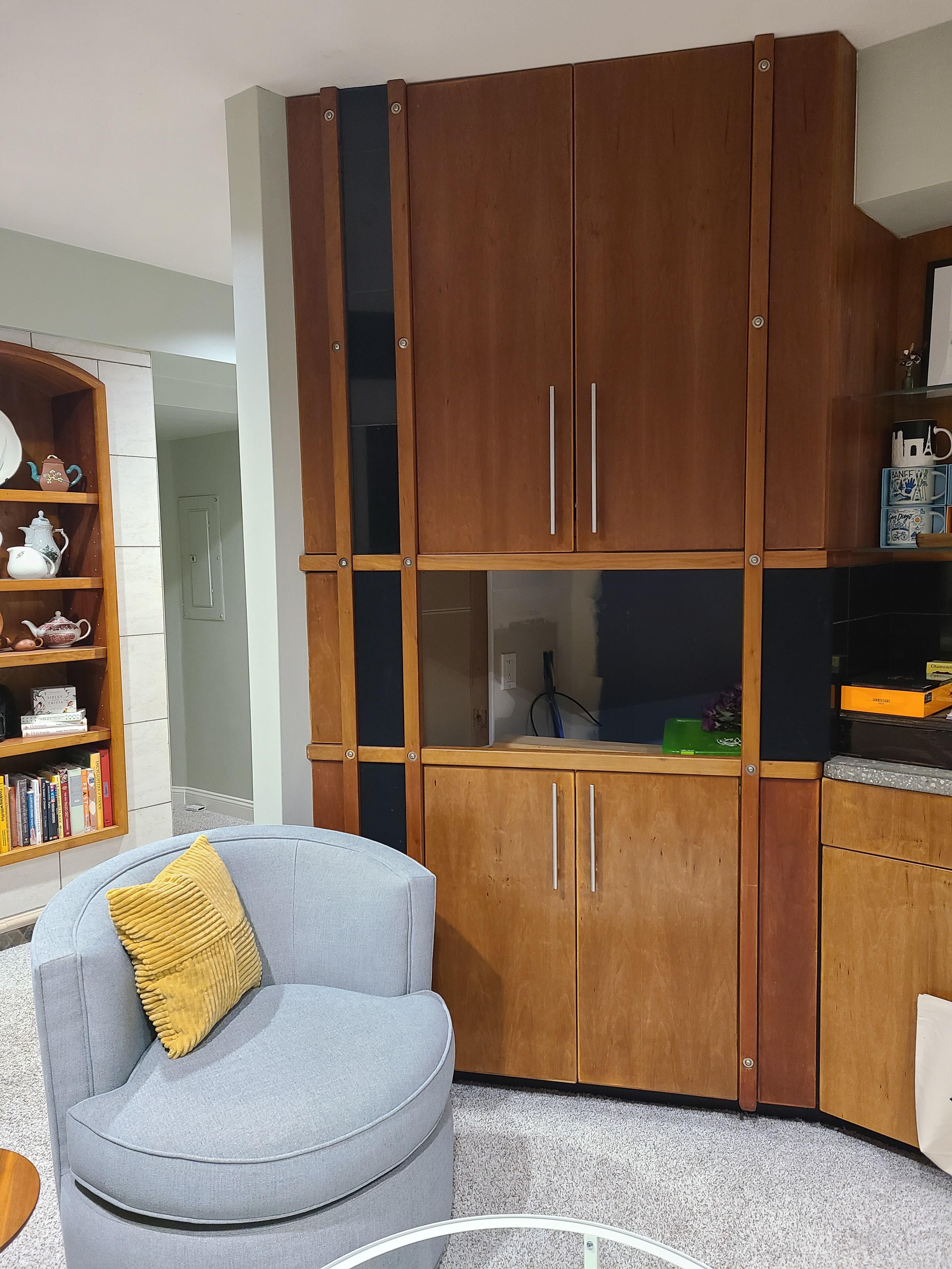 The home I recently moved into was added onto in the 90s, so there's lots of 90s quirks. One of them is this open cavity in these cabinets that's for an old television. Any ideas of what I should put in there or do with it for the time being? Would love to hear everyone's fun, whacky, or practical ideas!