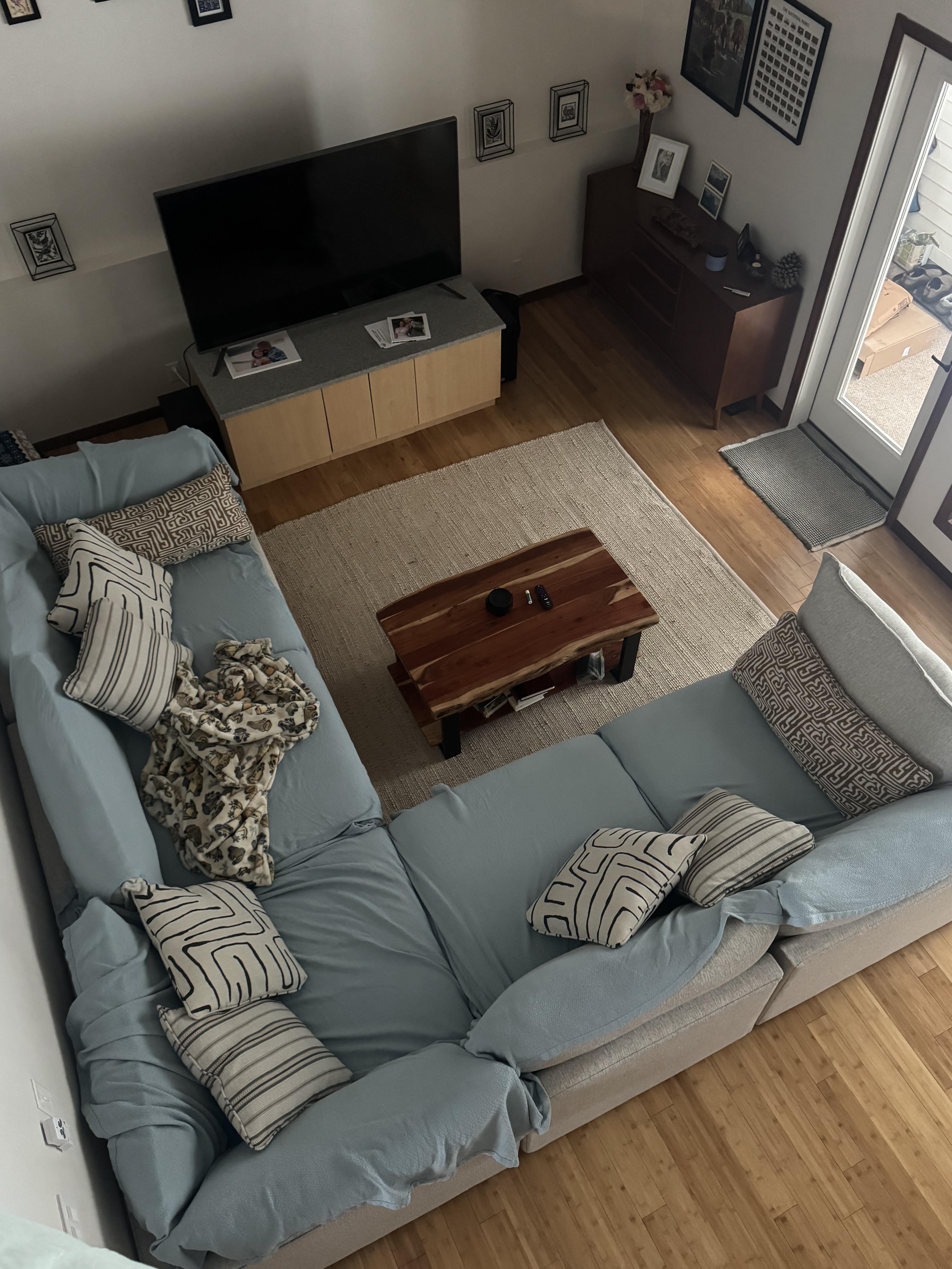 Larry-Lobster 1 week ago Current rug size looks fine. I would just pull out from under the couch some more