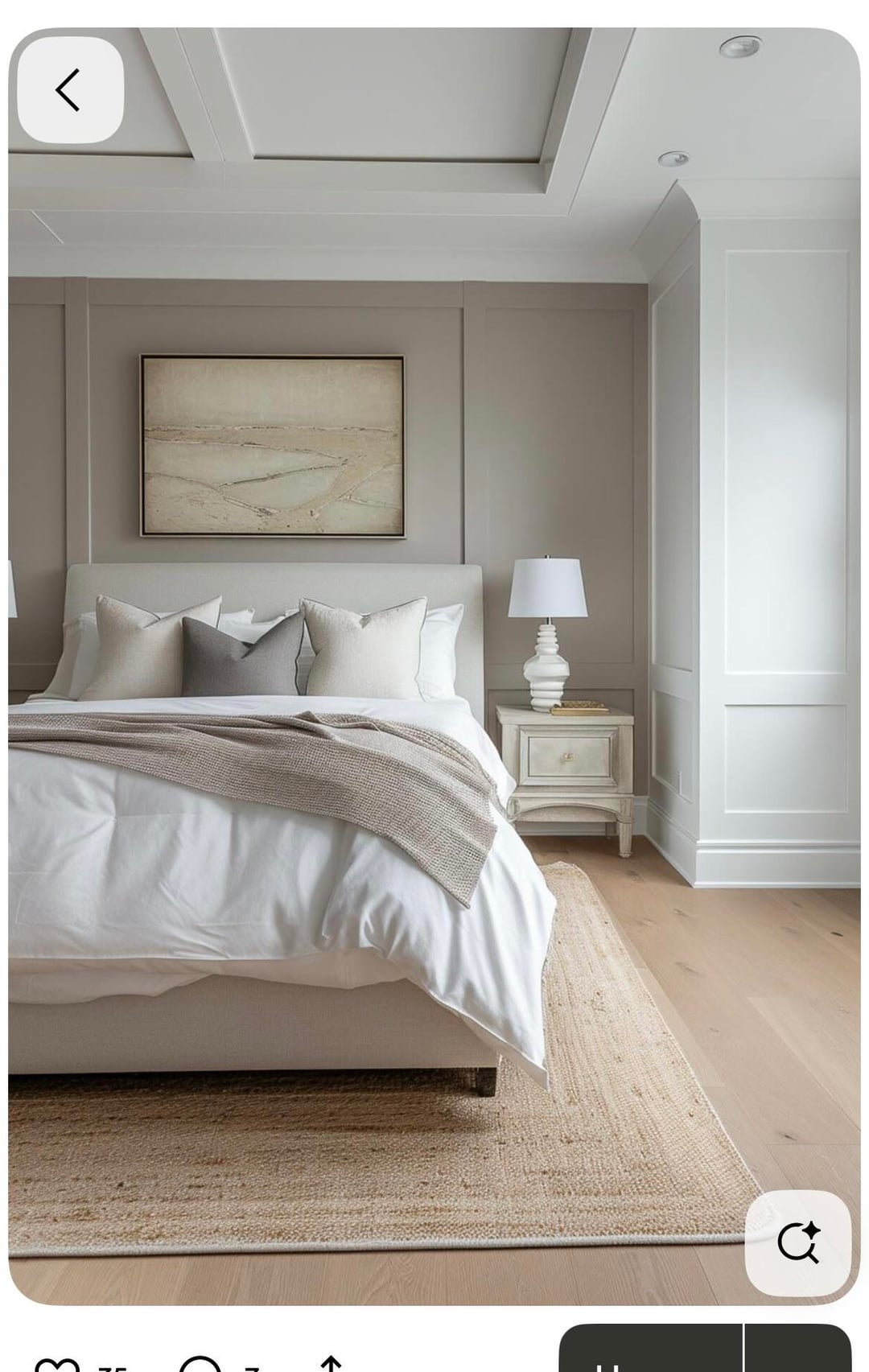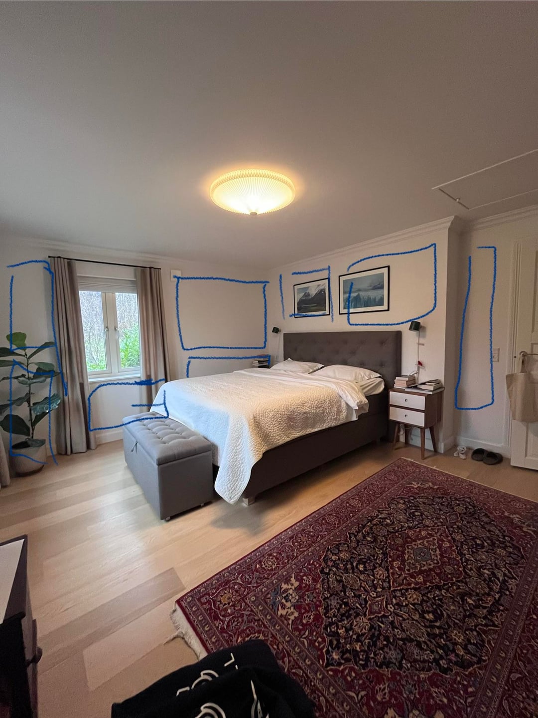 I dream of making this bedroom cosier and warmer. I would like to add high panelling to the walls, cover the bed in something lighter and paint the room a greige colour. The rug is unfortunately not going anywhere.