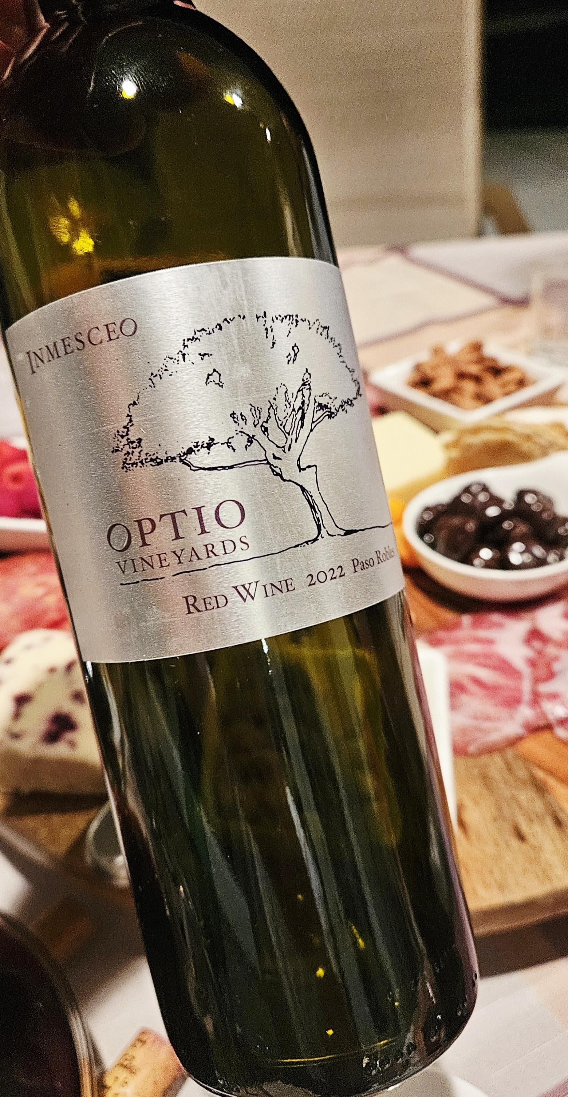 Optio Vineyards Inmesceo 2022, Paso Roblesby odedi1 Wine 1 Comment odedi1 2 weeks ago Dark ruby in color with a wide reddish rim.On the nose raspberries, black blueberries, cherries, plums, light oak, spices, chocolates, coffee and peppercorn.Medium plus in body with medium plus acidity.Dry on the palate with black cherries, plums, light oak, chocolates, herbs, coffee, licorice, light tobacco, light earth, cola, spices and peppercorn.Tangy finish with fine grained tannins and tangy raspberries.This 4 year old Cabernet Sauvignon blend from Paso Robles is drinking very nicely now. Elegant and rich. I really enjoyed the nose.At this point, the Mourvedre is more dominant, and it feels like a California Merlot. Tangy and interesting with nice complexity and mouthfeel.Good right out of the bottle, and ready to drink. I’ve had the 2023 vintage recently, which I liked better.A good food wine that paired nicely with my double cream Brie cheese.A blend of 50% Cabernet Sauvignon and 50% Mourvedre. Aged for 16 months in French oak barrels. A tiny production of only 900 bottles.14.5% alcohol by volume.91 points.$62.Write A CommentYou must be logged in to post a comment.