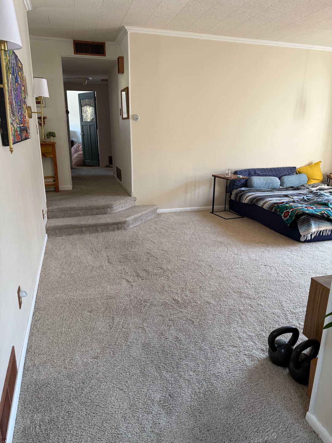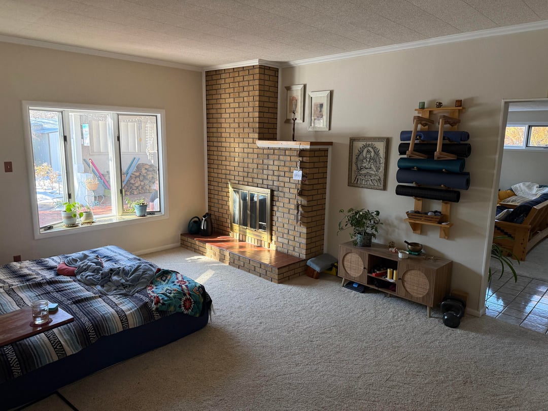 Our home has a large living room area separated by this fire place, I’m just showing you the room that I believe officially is named a ‘dining room’ but we use it as the ‘yoga room’. Open floor to do yoga and roll around on the carpet.