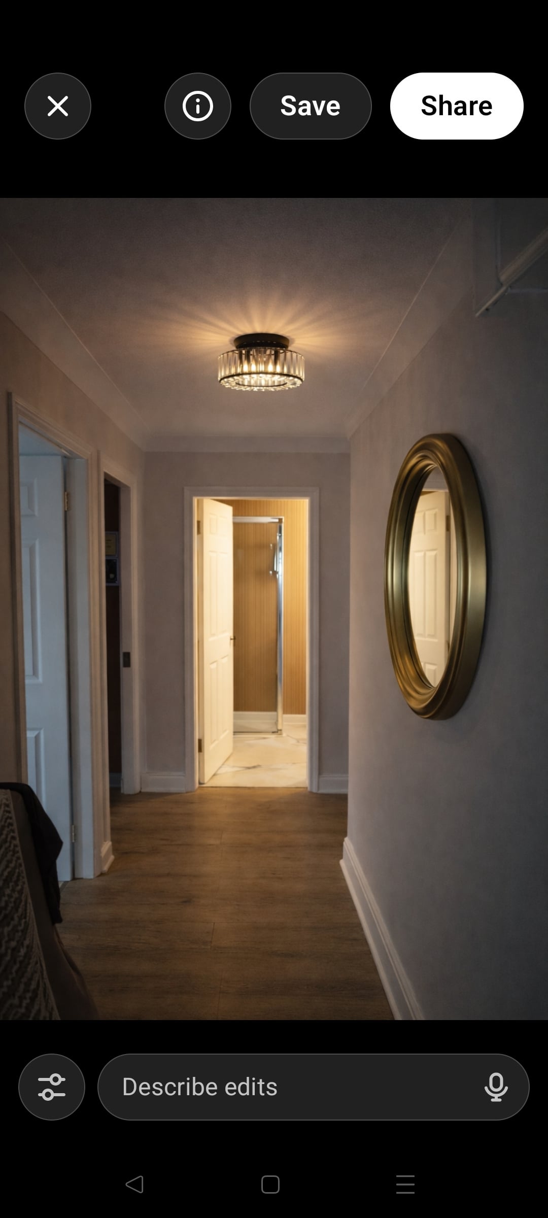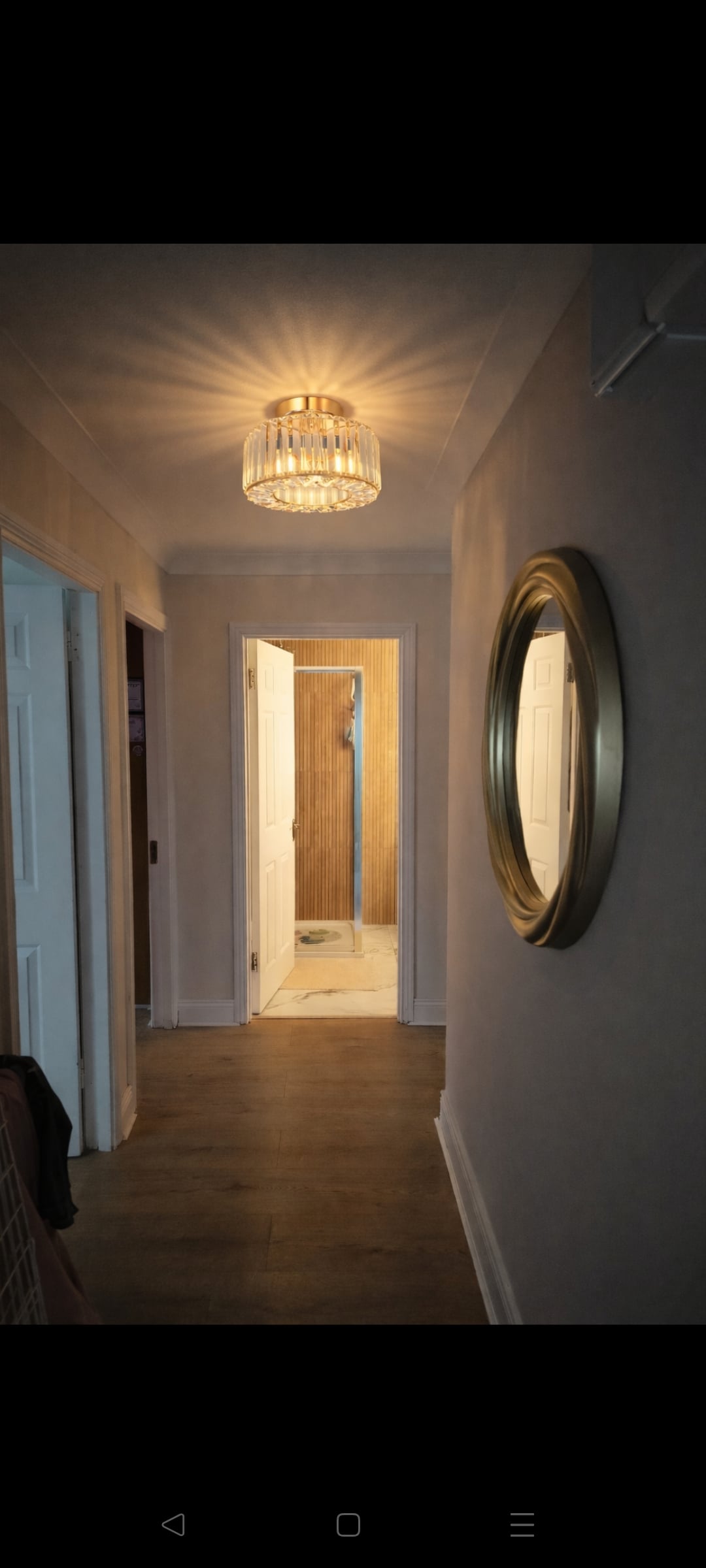 AI generated images of a fitting I want in my hallway. Can't decide between black or gold. I like the gold as it's warmer and goes with the gold mirror and warmer bathroom wood. But the black might be more modern. In real life the fittings are exactly the same size. What do you think?