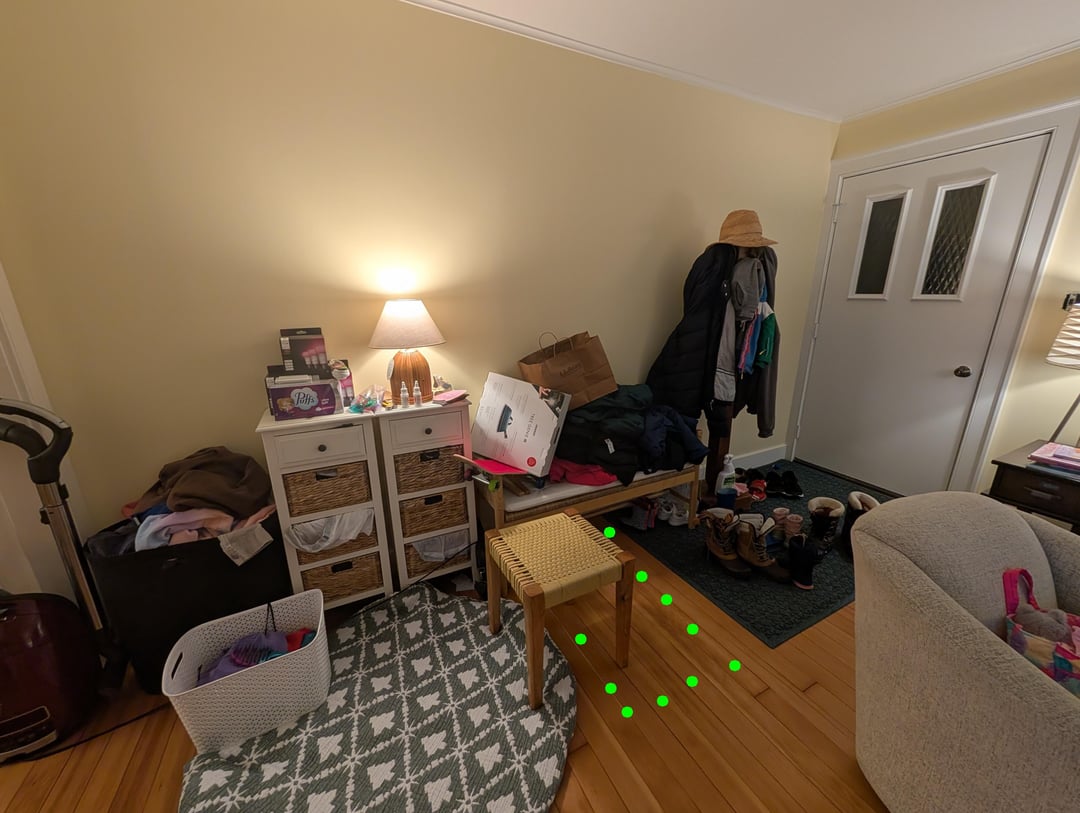 I put a blanket 4' in diameter which is size I'd go with. The attempt would be to anchor the little area with the tables, gloves/coat basket (will get better looking furniture for that). I know the stool blocks the path forward but really want to keep the area contained and functionally block people from walking in with their shoes.
