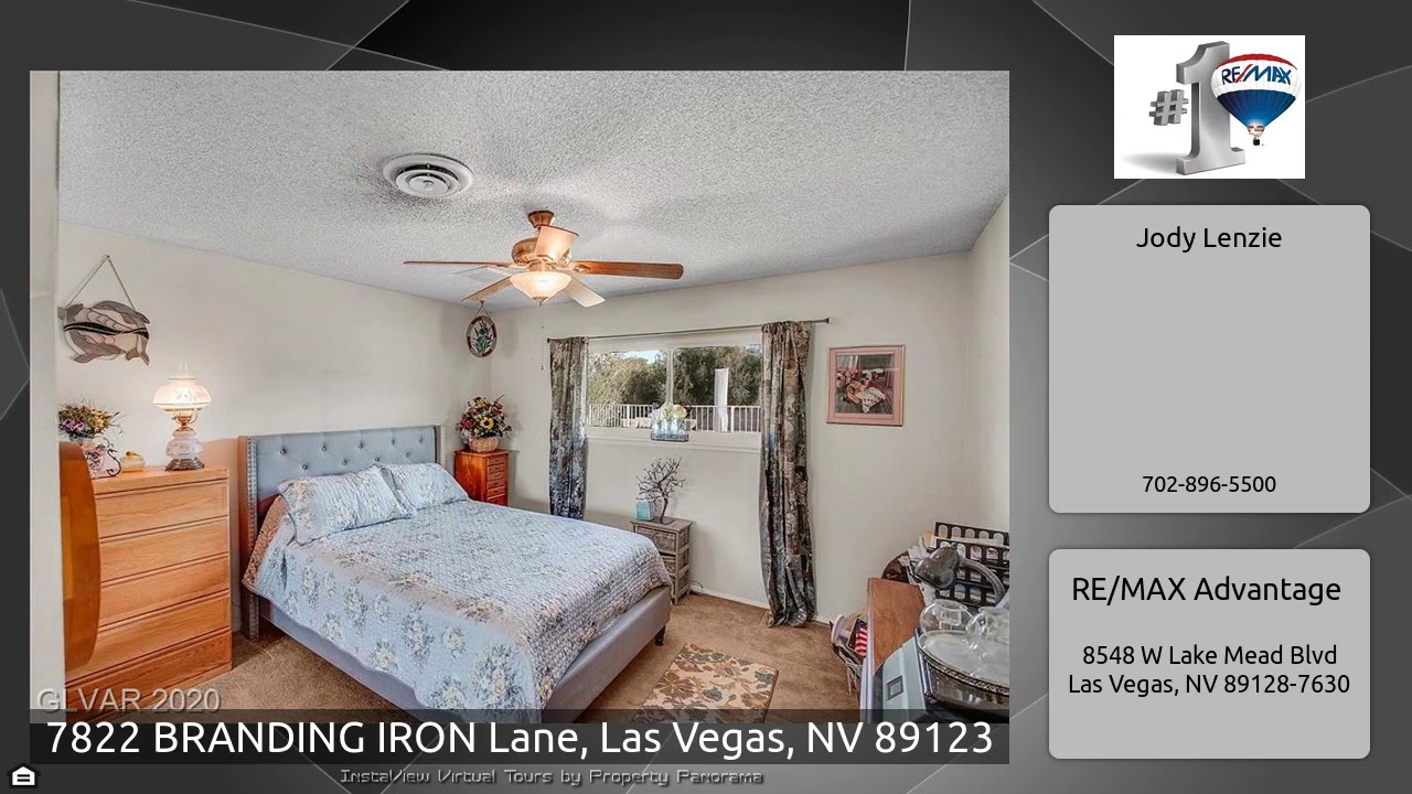 The Virtual Tour for the property at 7822 BRANDING IRON Lane, Las Vegas, NV 89123 listed for $550,000: Other homes for sale by Jody Lenzie of RE/MAX Advantage: Great half acre property w/detached, oversized 3 car garage!Electronic gates to backyard*large inground pool w/diving board*covered patio*grass area*great 1 story home with tile roof*newer windows*updated tile flooring*kitchen with corian counters, newer appliances*big living room with built-in entertainment center with electric fireplace*dining area with built-in desk & cabs*French doors*den with gas fireplace*large bedrooms*remodeled …
