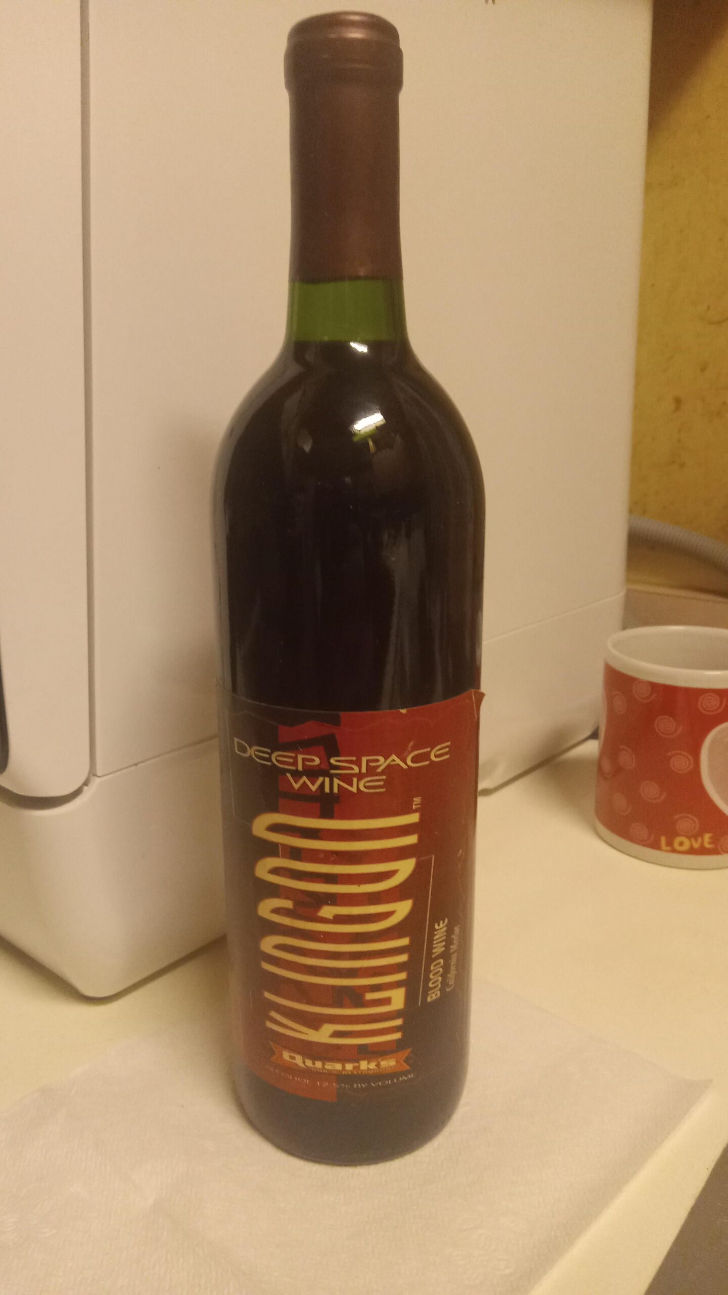 "Genuine" Klingon Bloodwine from Quarks Bar & Restaurant at the Las Vegas Star Trek Experience (now closed, i believe). It is a California merlot, unopened and wiped clean for pic.